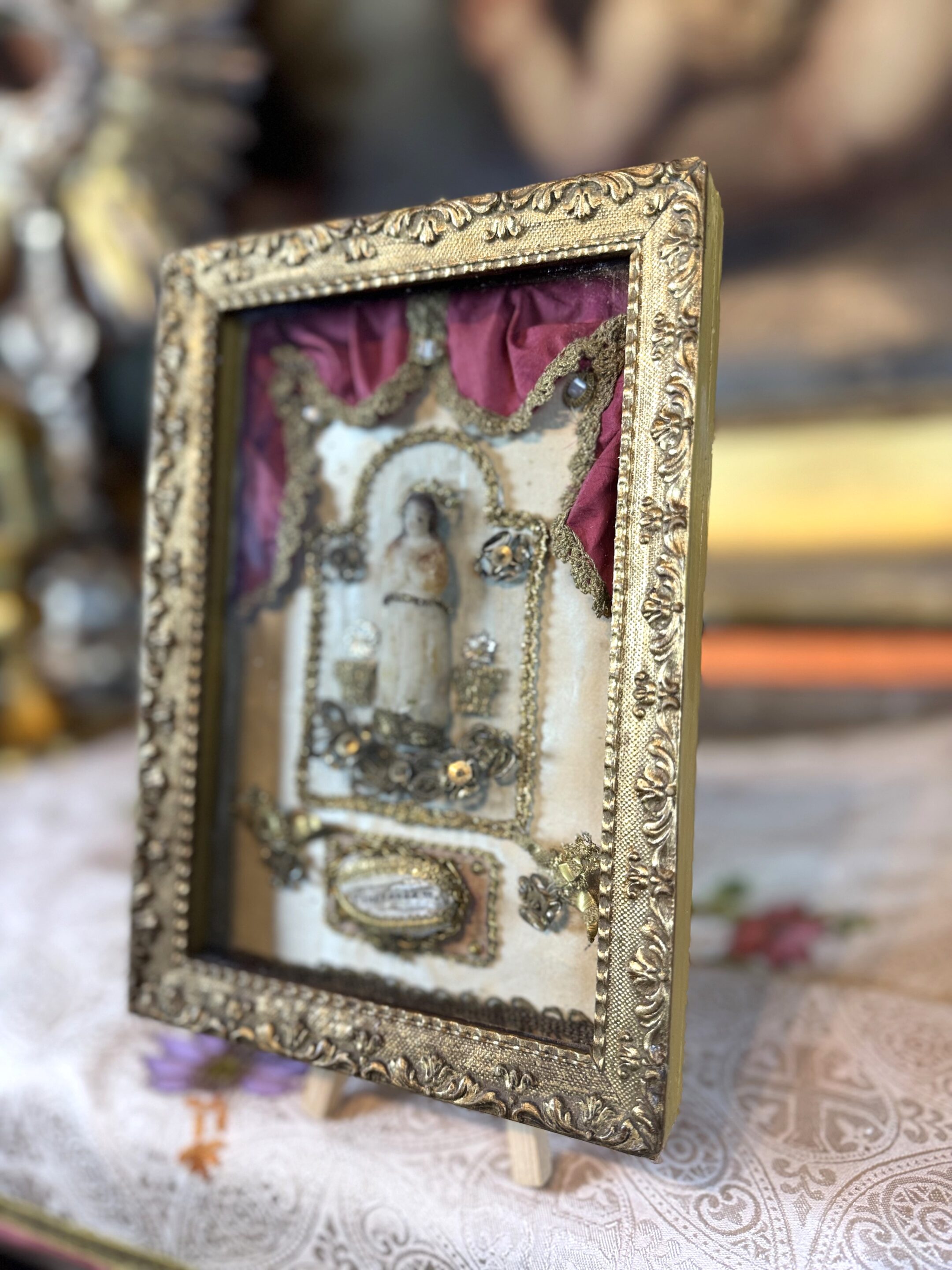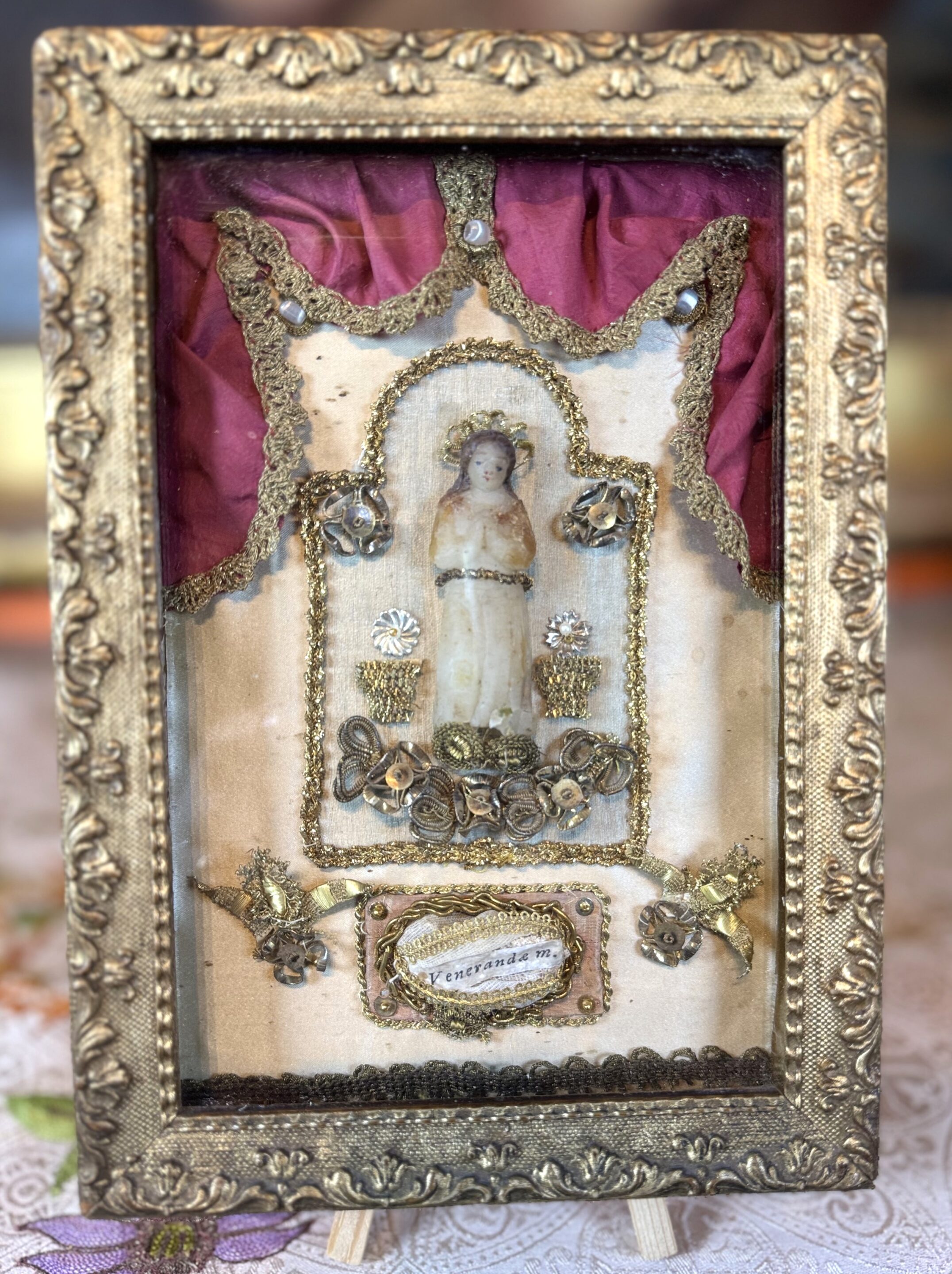 It is surrounded by braid trimmings and a cannetilles assembly of gold threads and pearls. In the center of the work, a wax figure, probably our Venerable Saint here in prayer, is honored.