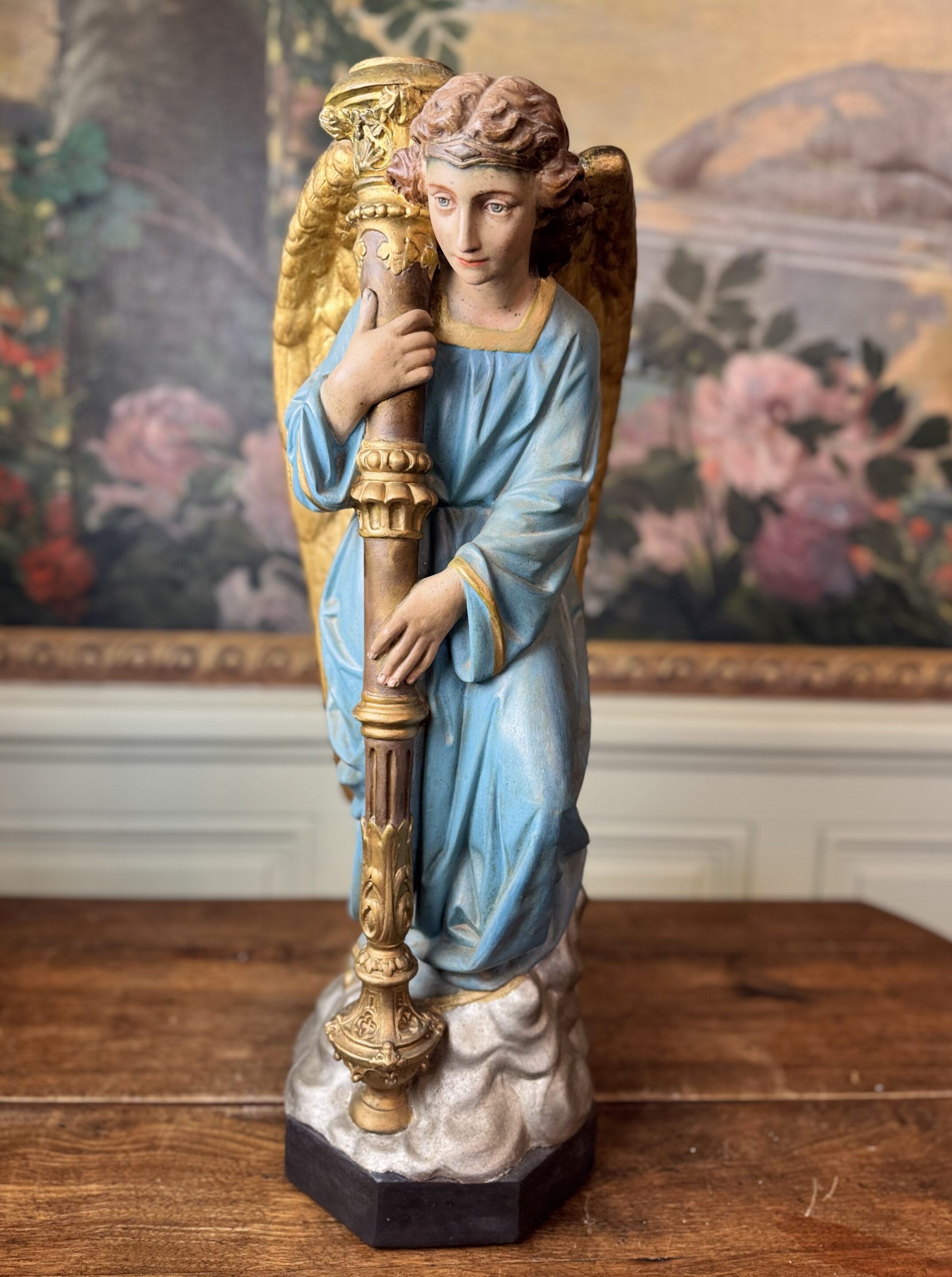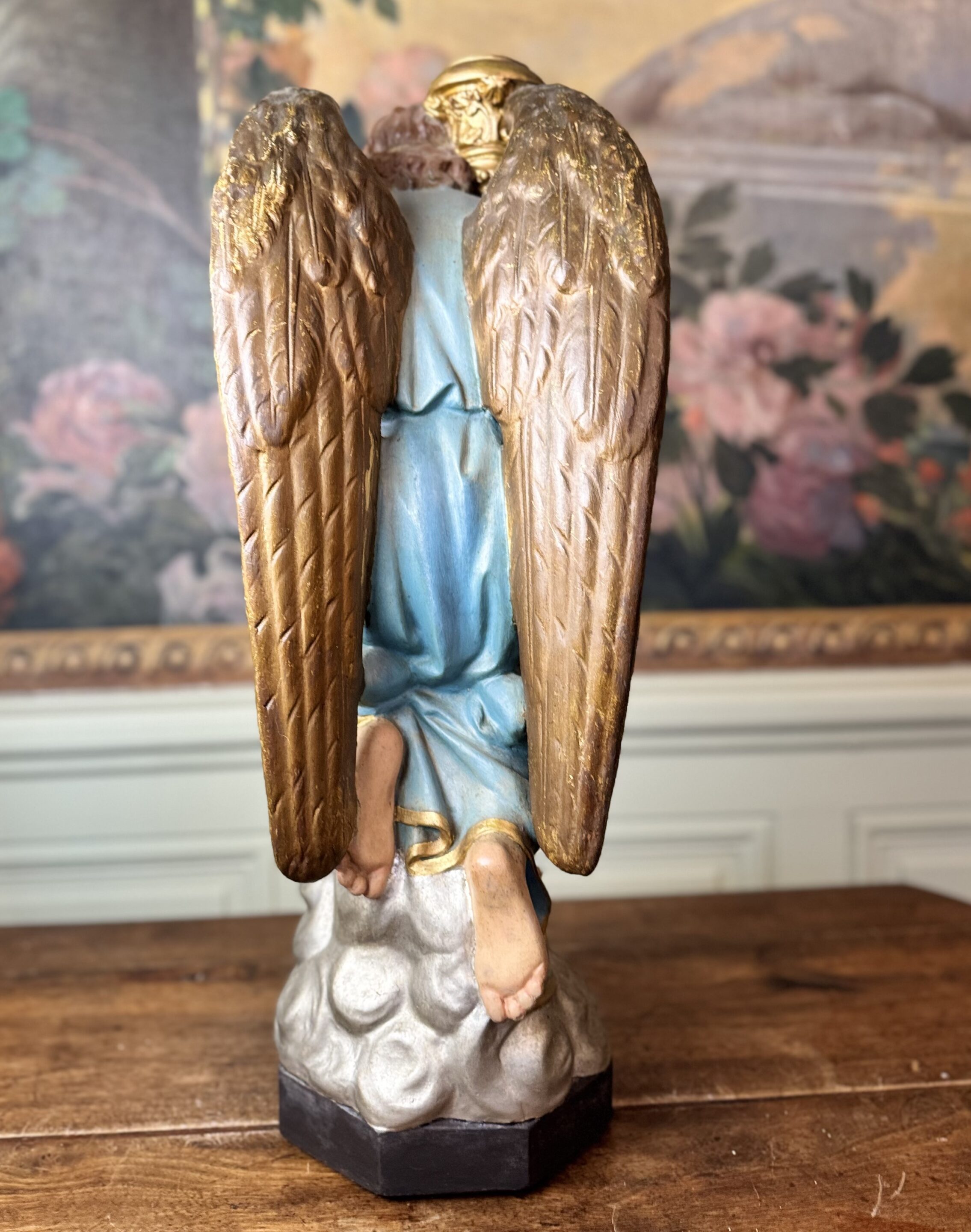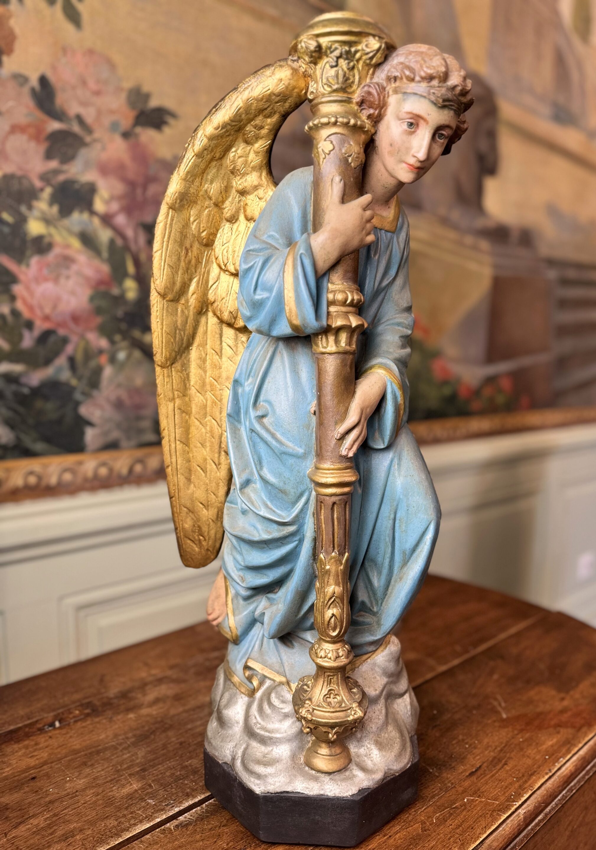 Dating from the Sulpician period around 1870, our plaster angel is in beautiful condition and adorned with lovely polychromy. He rests on the Cloud in a tender and pious pose. With gilded wings and finely rendered hair, he wears a pastel blue tunic enhanced with gilding and holds a richly ornamented neo-Gothic candelabra.