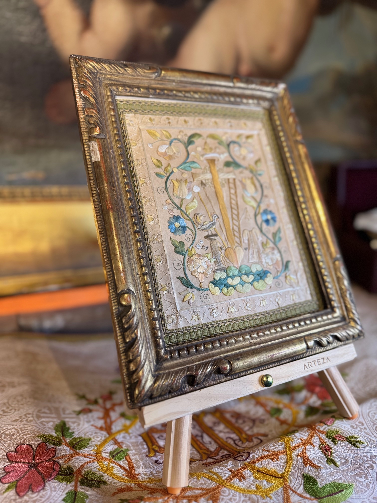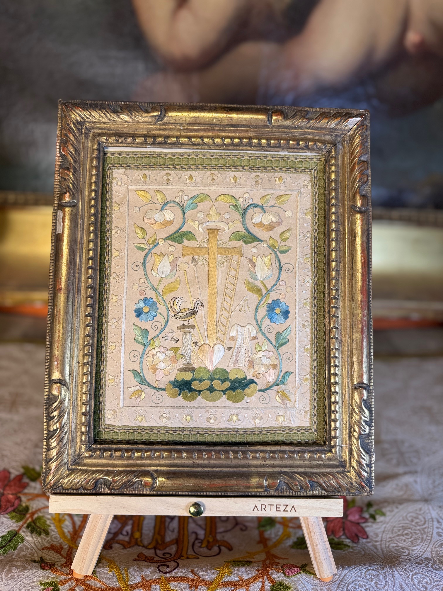 This polychrome silk embroidery, worked in satin stitch and satin stitch on cream paper, depicts the instruments of the Passion. They are placed within a floral cartouche in soft colors.