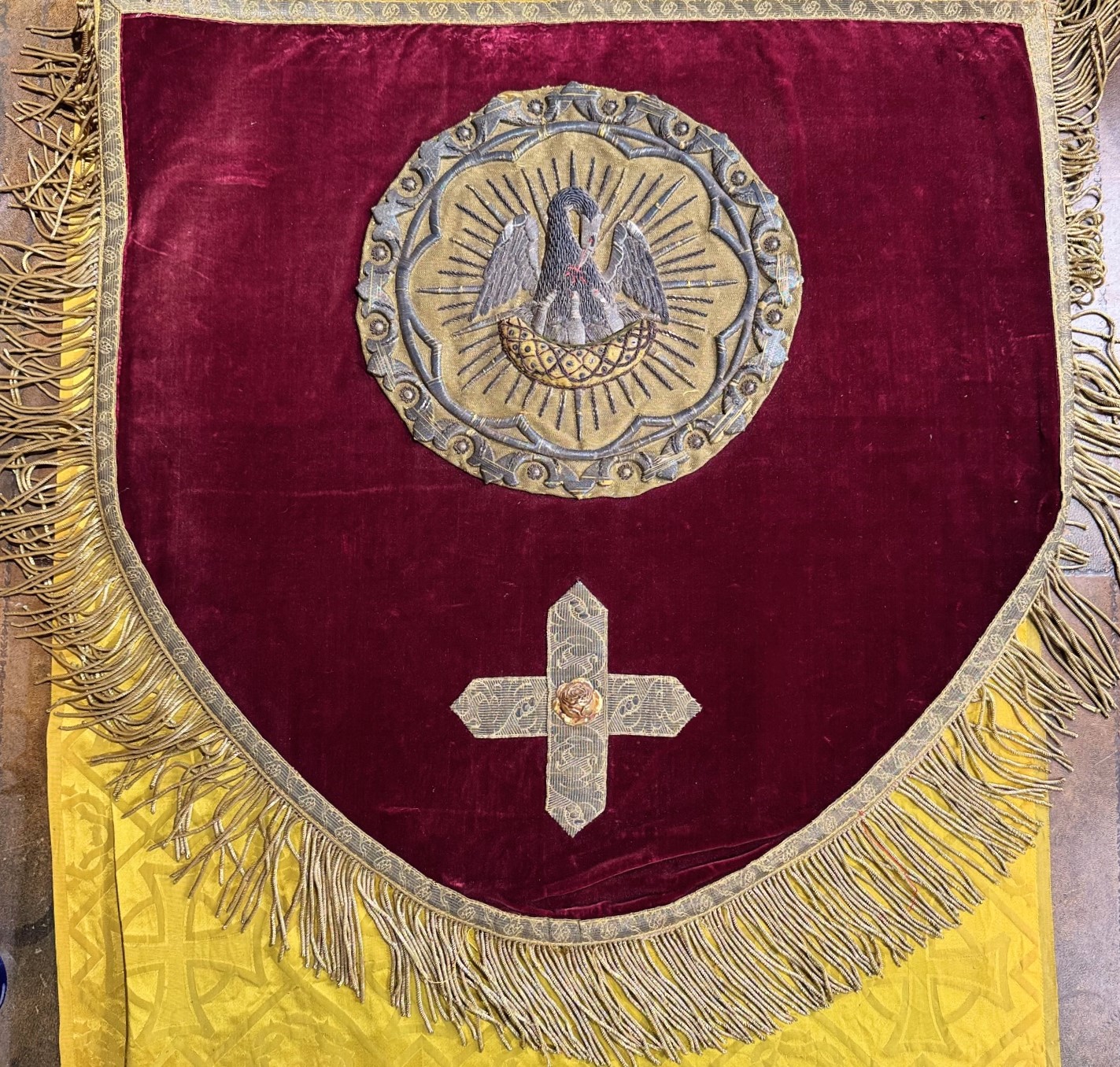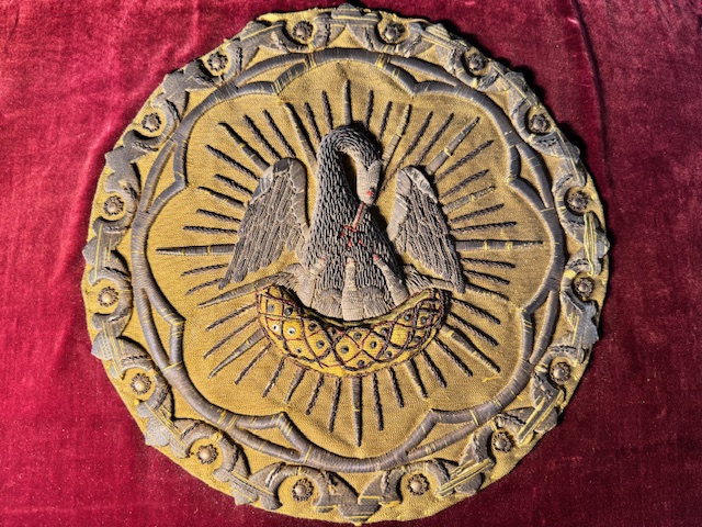 Dos de chape liturgique en velours rouge avec un fin travail de broderie, représentant la charité du Christ, le pélican nourrissant ses enfants avec sa propre chair. Frange en fils d'or.