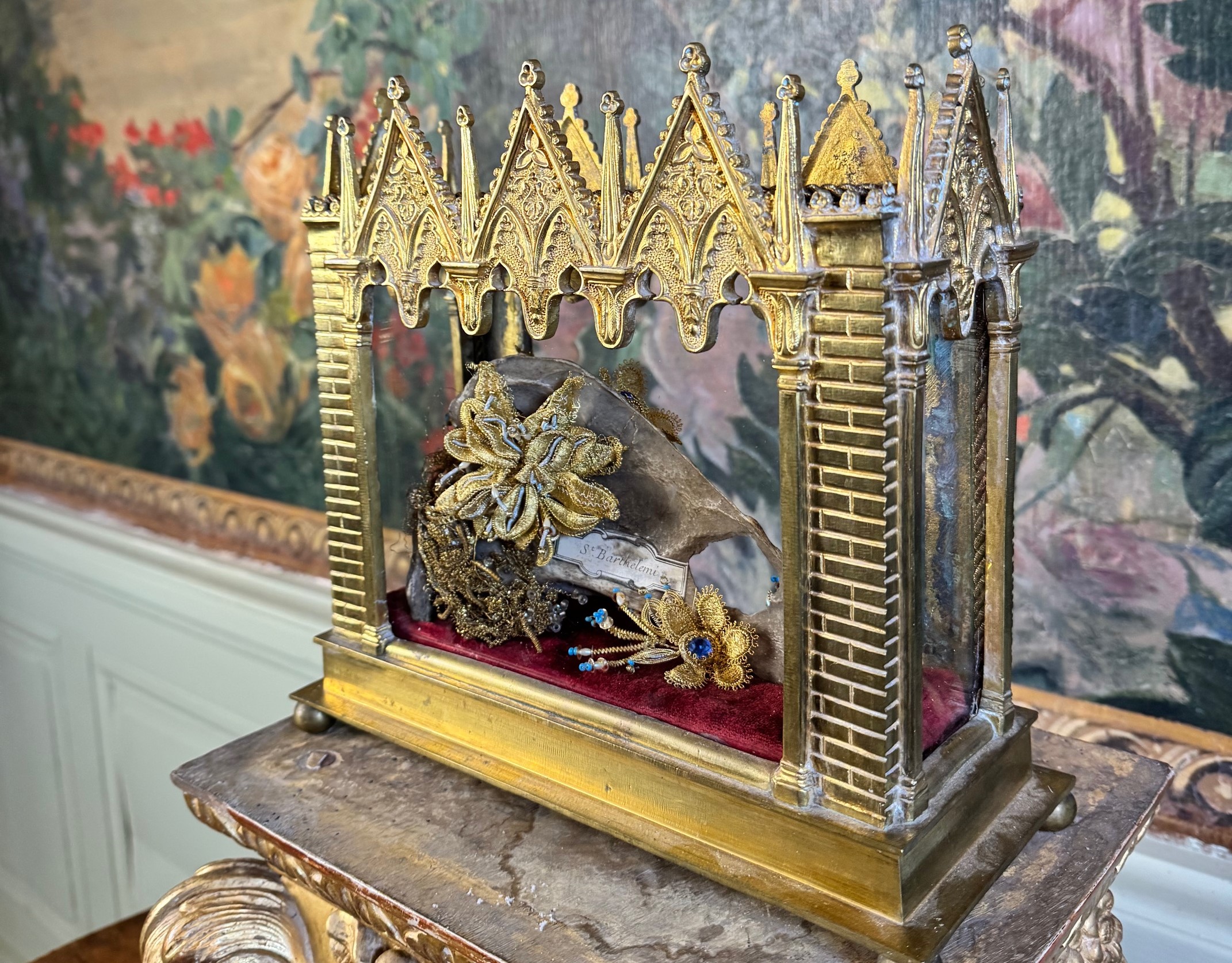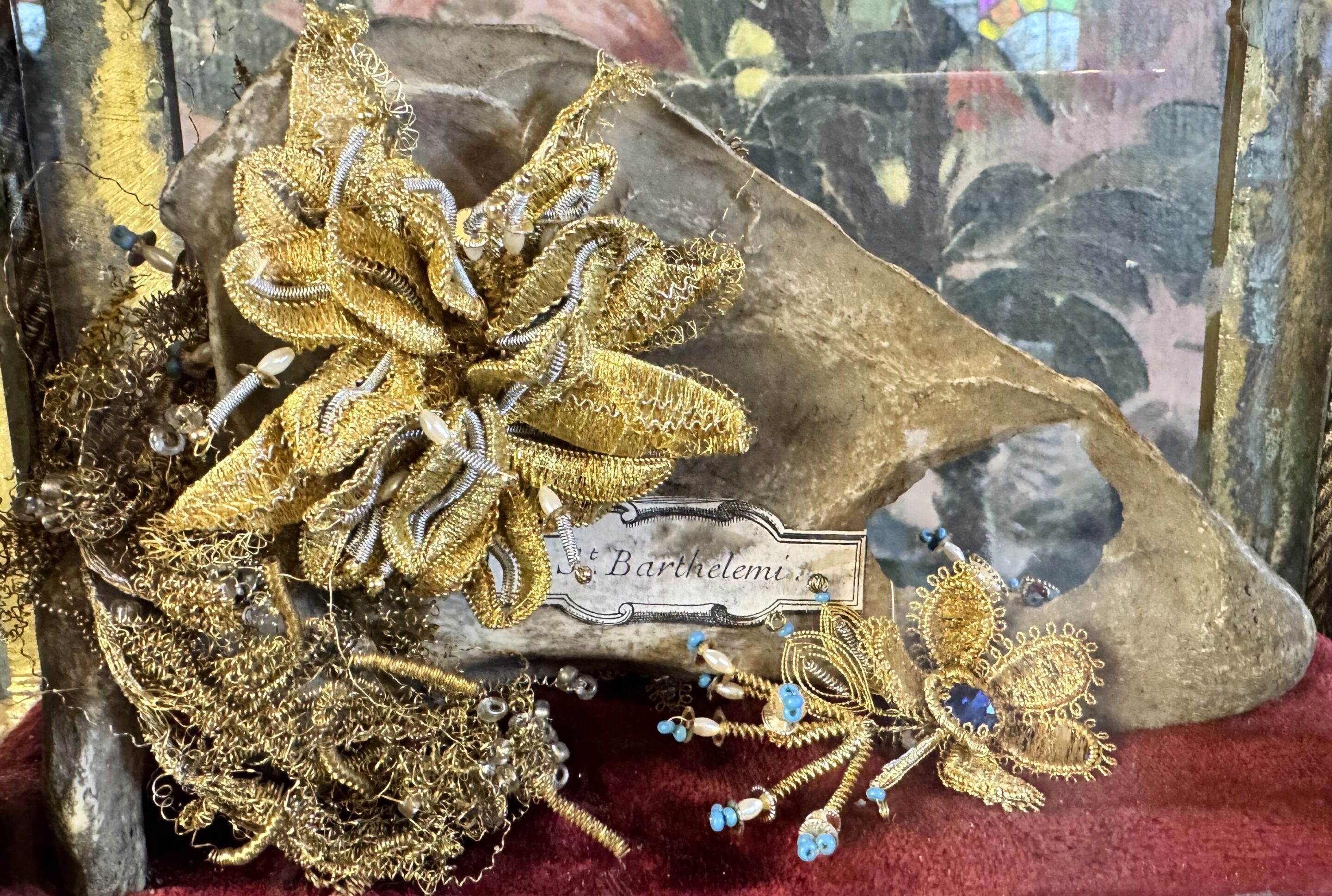 Dans un reliquaire néogothique du XIXe, vitré cinq faces, en laiton doré, trône une importante relique ex-ossibus. il s'agit là d'un omoplate, de Saint Barthelemy reposant sur un velours rouge et agrémenté de cannetilles dorées.