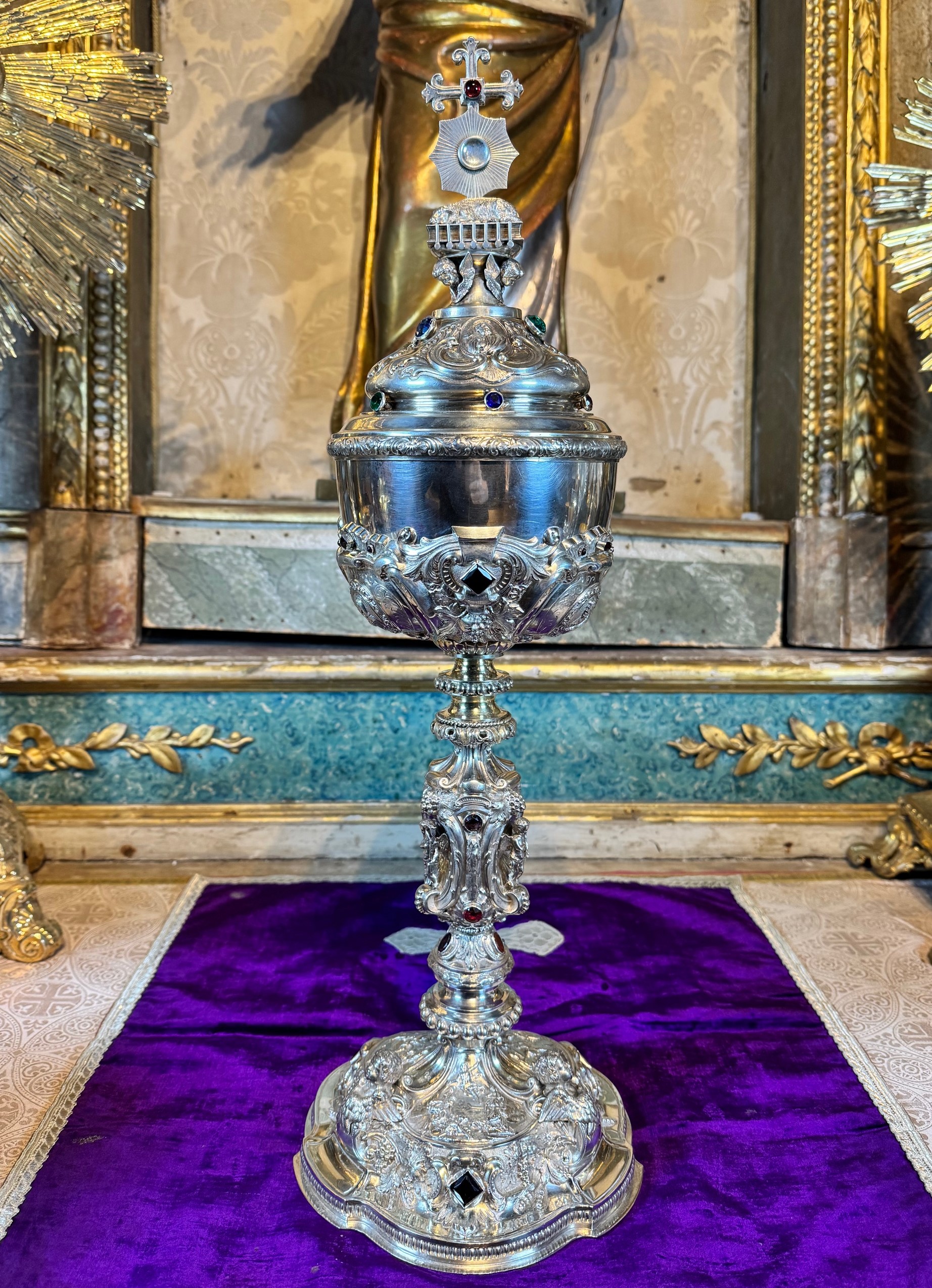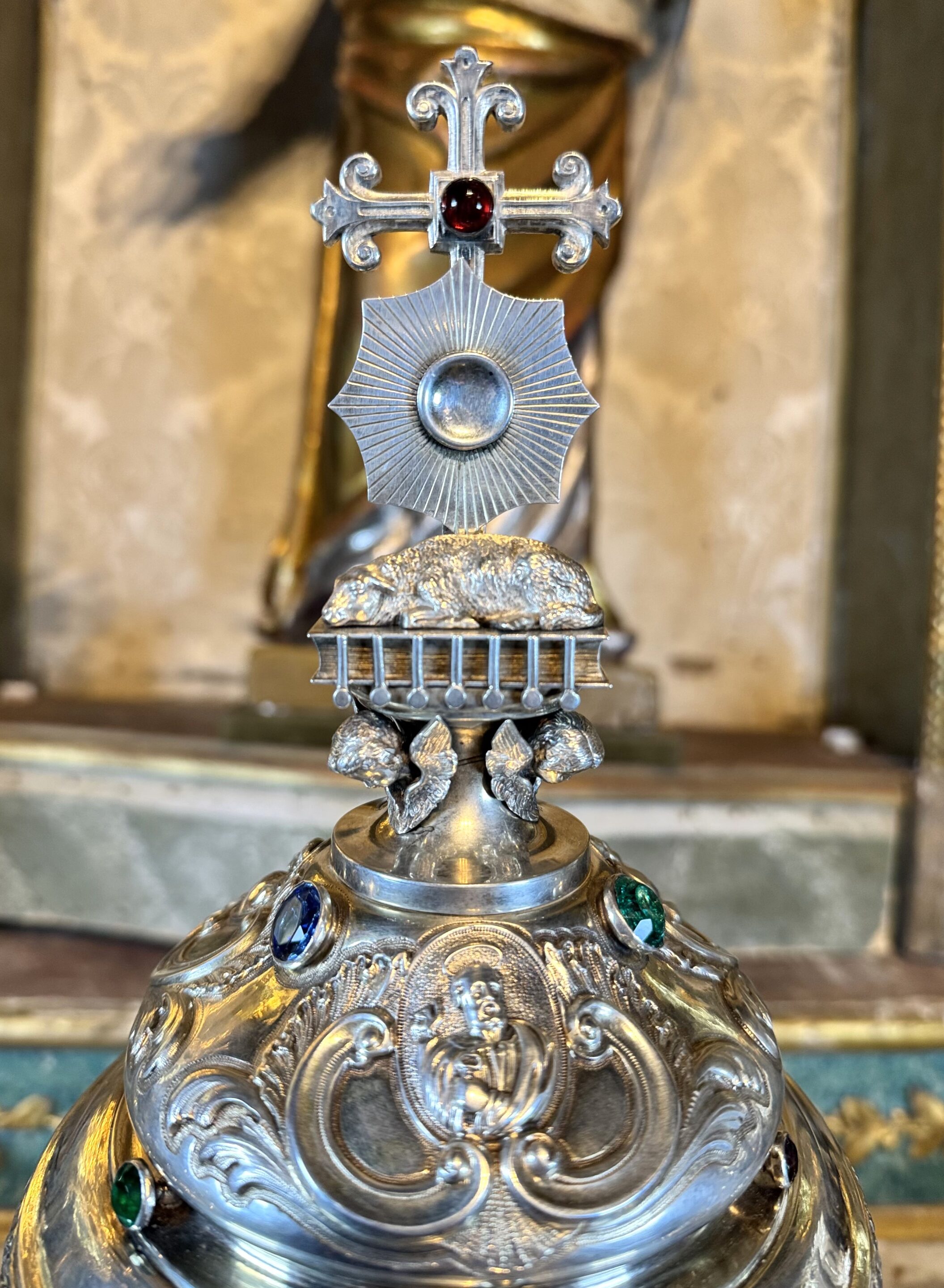 The knop is decorated with three angels holding lilies and an anchor, a symbol of hope. The cup is decorated with images of the Holy Family: Joseph, Mary, and Jesus Christ, as well as Eucharistic symbols. The lid is further embellished with images of the apostles Peter and Paul and John the Baptist. The whole is surmounted by an ornate cross and the Lamb of God. Solid silver, marked 800/1000.
