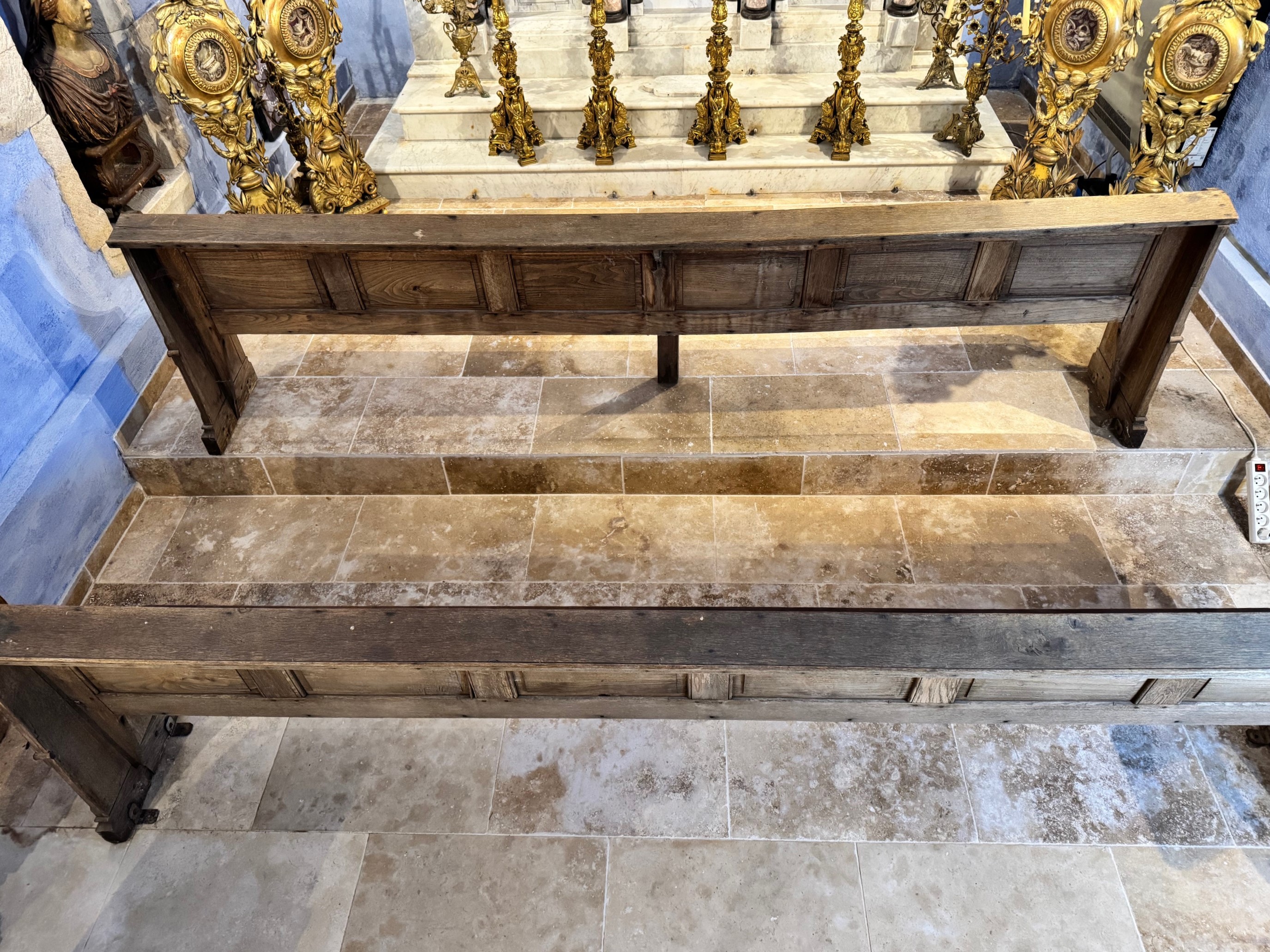 Two large late 19th- or early 20th-century wooden benches fromfrom a chapel in the Rhone region. Dimensions 305 cm long by 40 wide and 82 cm high Used condition - a few chips but the wood is sound.