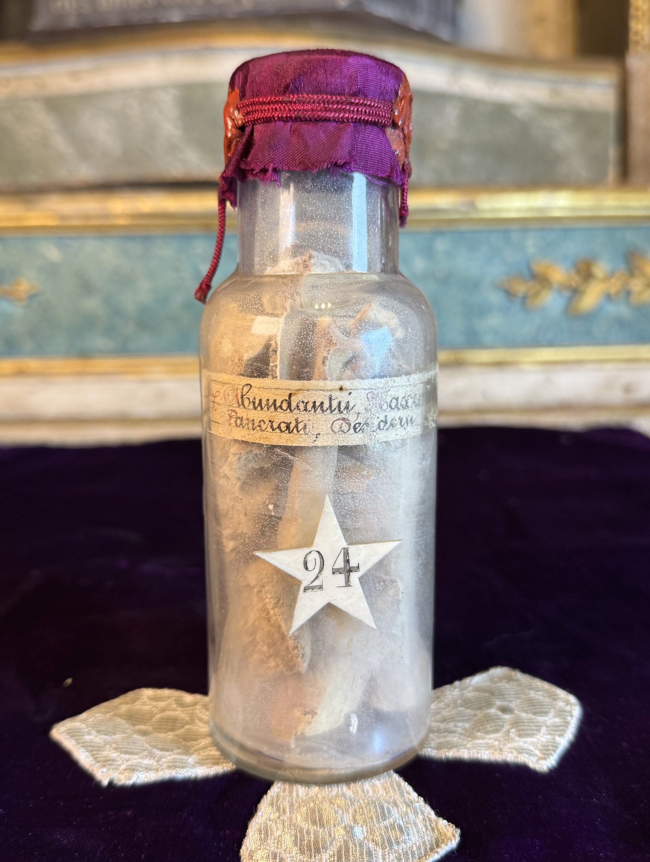 Made of glass, our cylinder bears a scroll indicating that it contains relics of Saints Abondius, Maximin, Pancras, and Desiderius, Martyrs of the early centuries. In Latin: Abundatii, Maximi, Pancarti, Desiderii. It contains numerous fragments, ex ossibus. The stopper is sealed with a red cord and two episcopal seals. Dimensions: 16 cm high. Good condition.