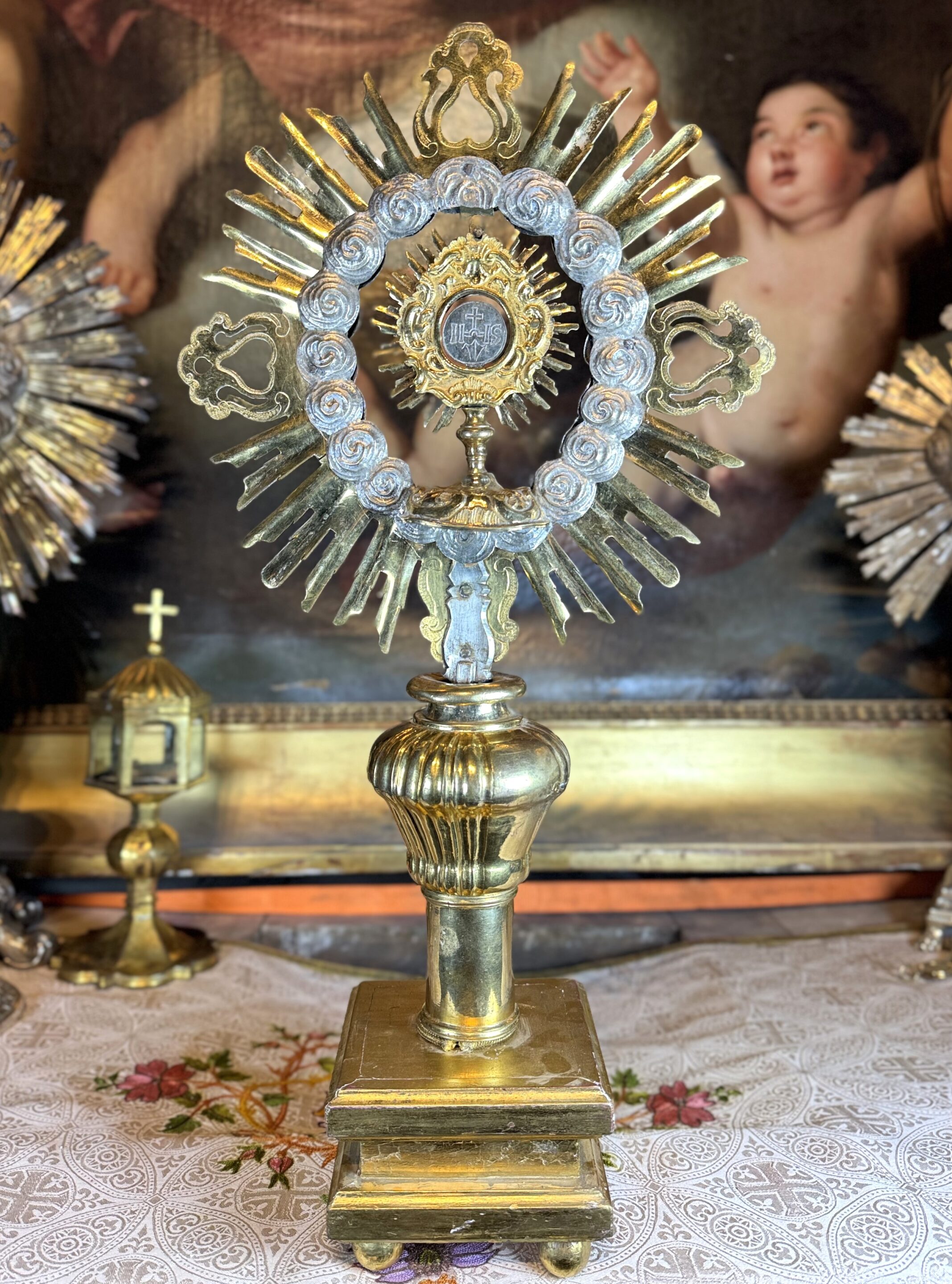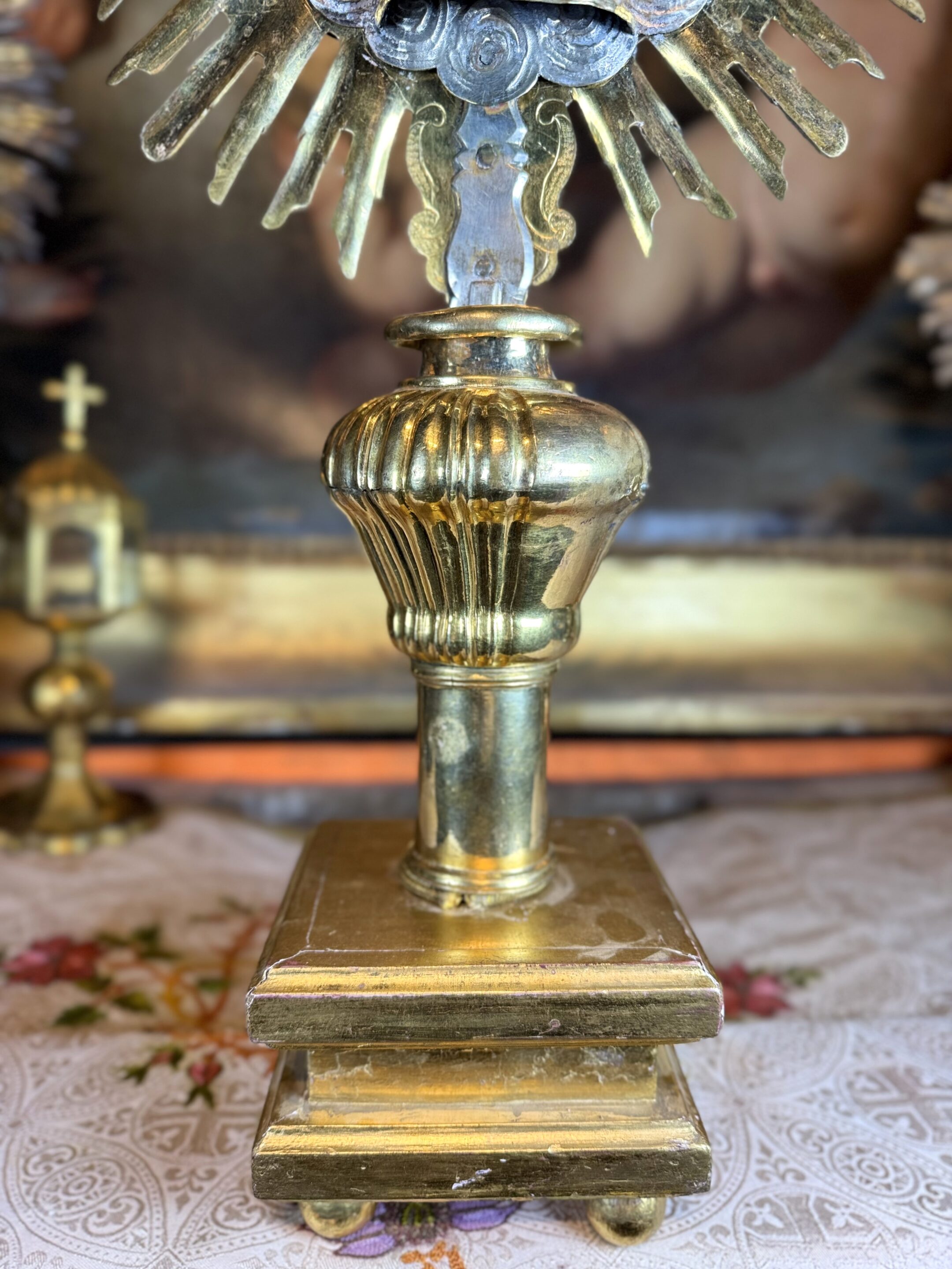 Beautiful 18th century processional element in gilded brass resting on a later base in gilded wood.