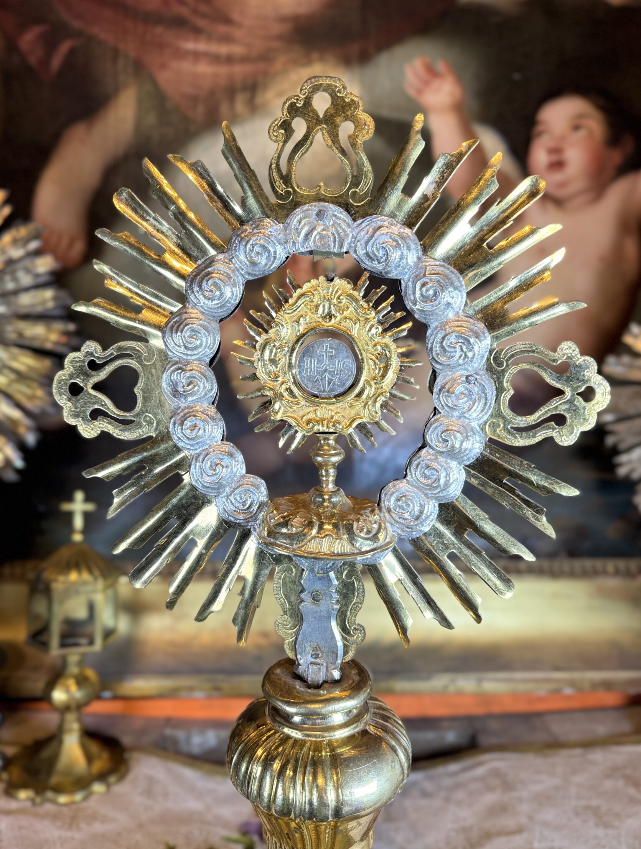 Le Sauveur de l’humanité représenté par son monogramme est ici en lieu et place de l’hostie. Au cœur même d’une petite monstrance, laquelle est enchâssée dans un ensemble plus important comprenant Nuée, Gloire et trois cœurs.