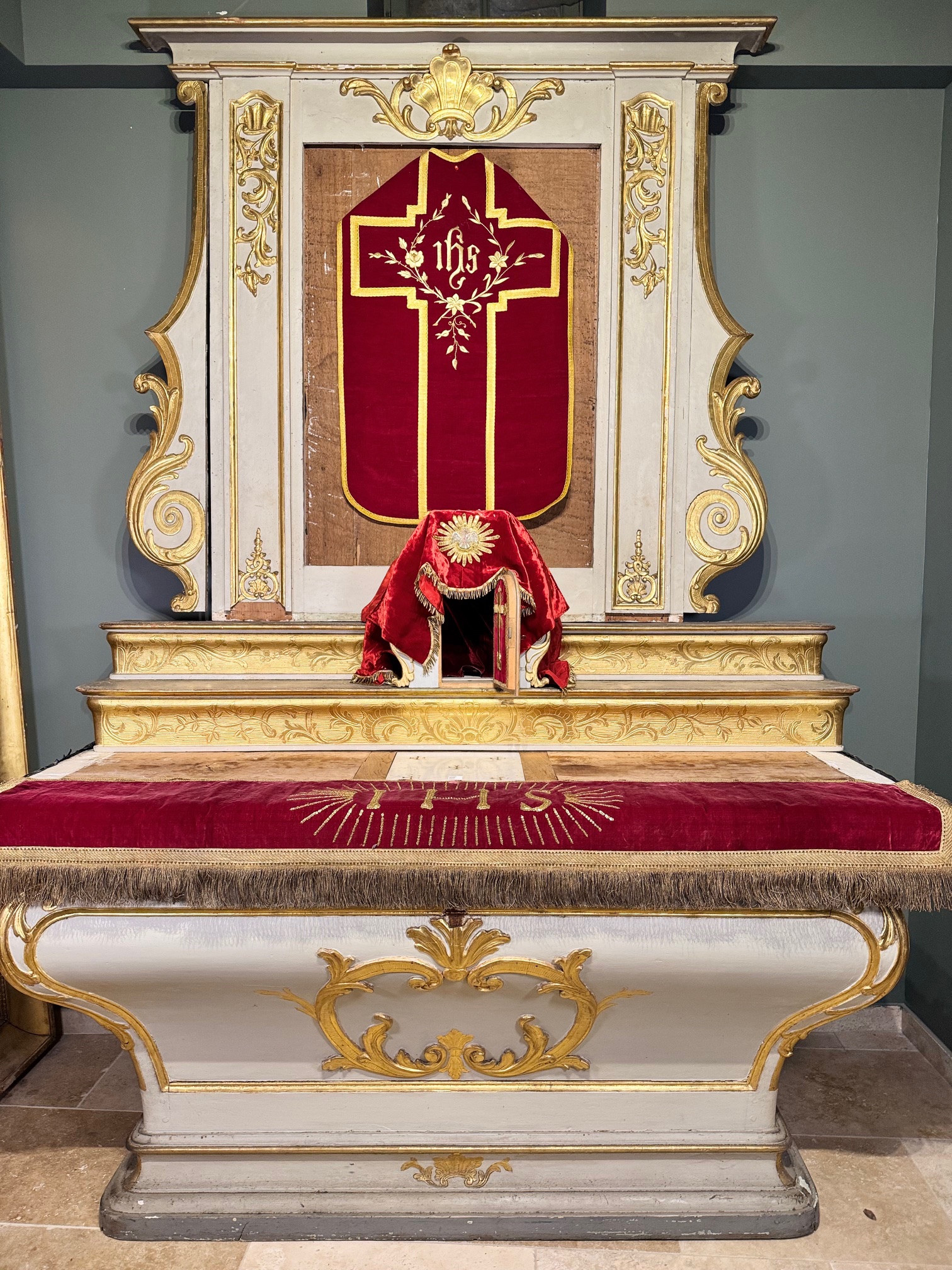 A curved altar in molded and carved wood, lacquered and richly gilded, adorned with an elegant decoration of shells and foliate scrolls. The ensemble includes its tabernacle, altarpiece, and steps, forming a harmonious liturgical unit. The altar retains its marble altar stone with its relic. The antependium opens at the rear with two molded doors for storing chasubles. A late 17th or early 18th-century work, originating from a chapel in the Grenoble region. In good condition despite the absence of the trumeau canvas – some losses and minor damage. In three sections. Dimensions: 285 cm high x 189 cm long x 90 cm deep.