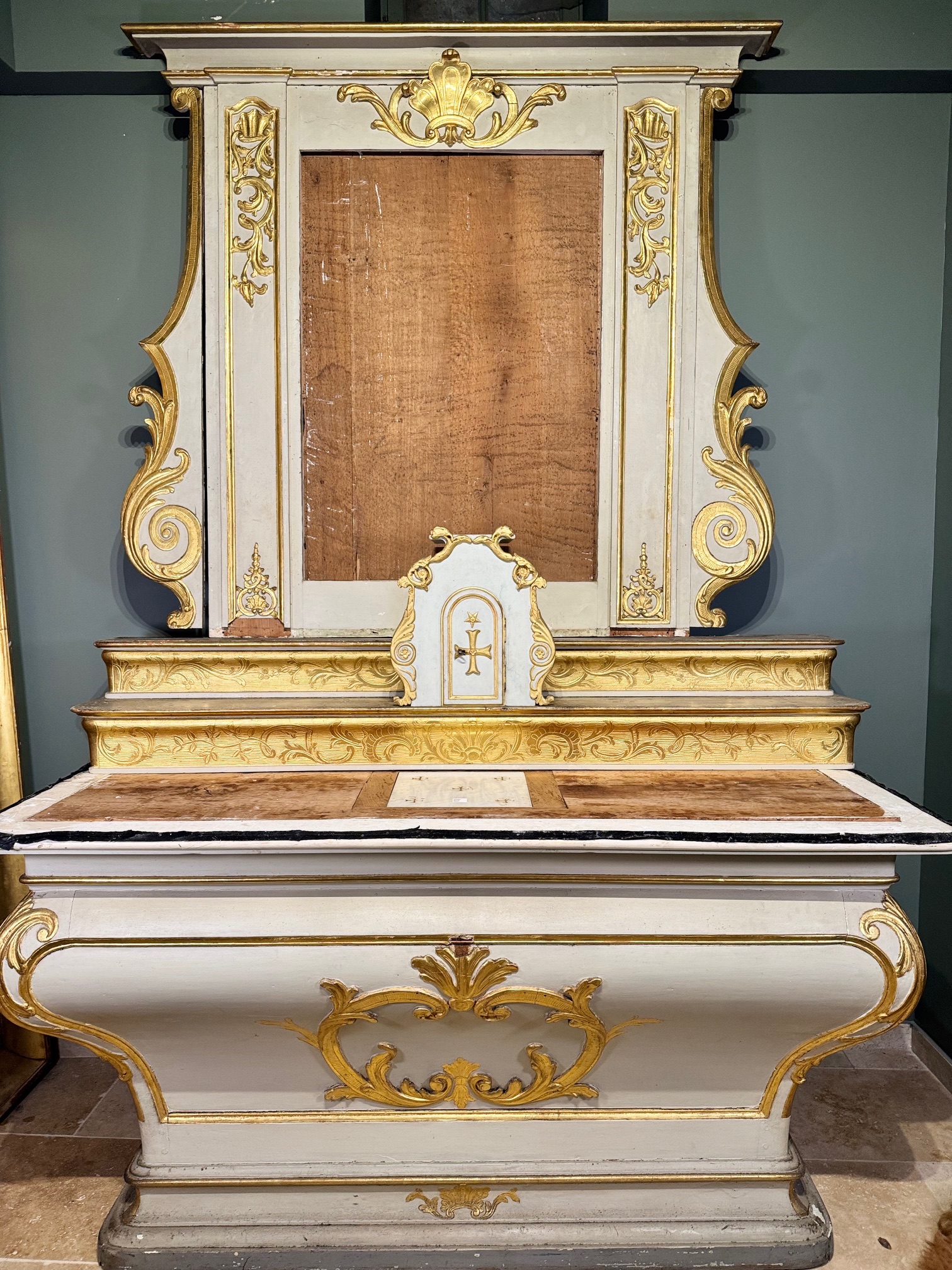Autel galbé en bois mouluré et sculpté, laqué et richement rehaussé de dorures, orné d’un élégant décor de coquilles et de rinceaux feuillagés. L’ensemble comprend son tabernacle, son retable et ses gradins, formant un harmonieux ensemble liturgique. L’autel conserve sa pierre d’autel en marbre avec relique. Enfin, l’antependium s’ouvre à l’arrière par deux portes moulurées permettant le rangement des chasubles. Travail du début du XVIIIᵉ siècle, provenant d’une chapelle de la région de Grenoble. Bel état malgré l’absence de la toile du trumeau – quelques manques et petits accidents. En trois éléments.