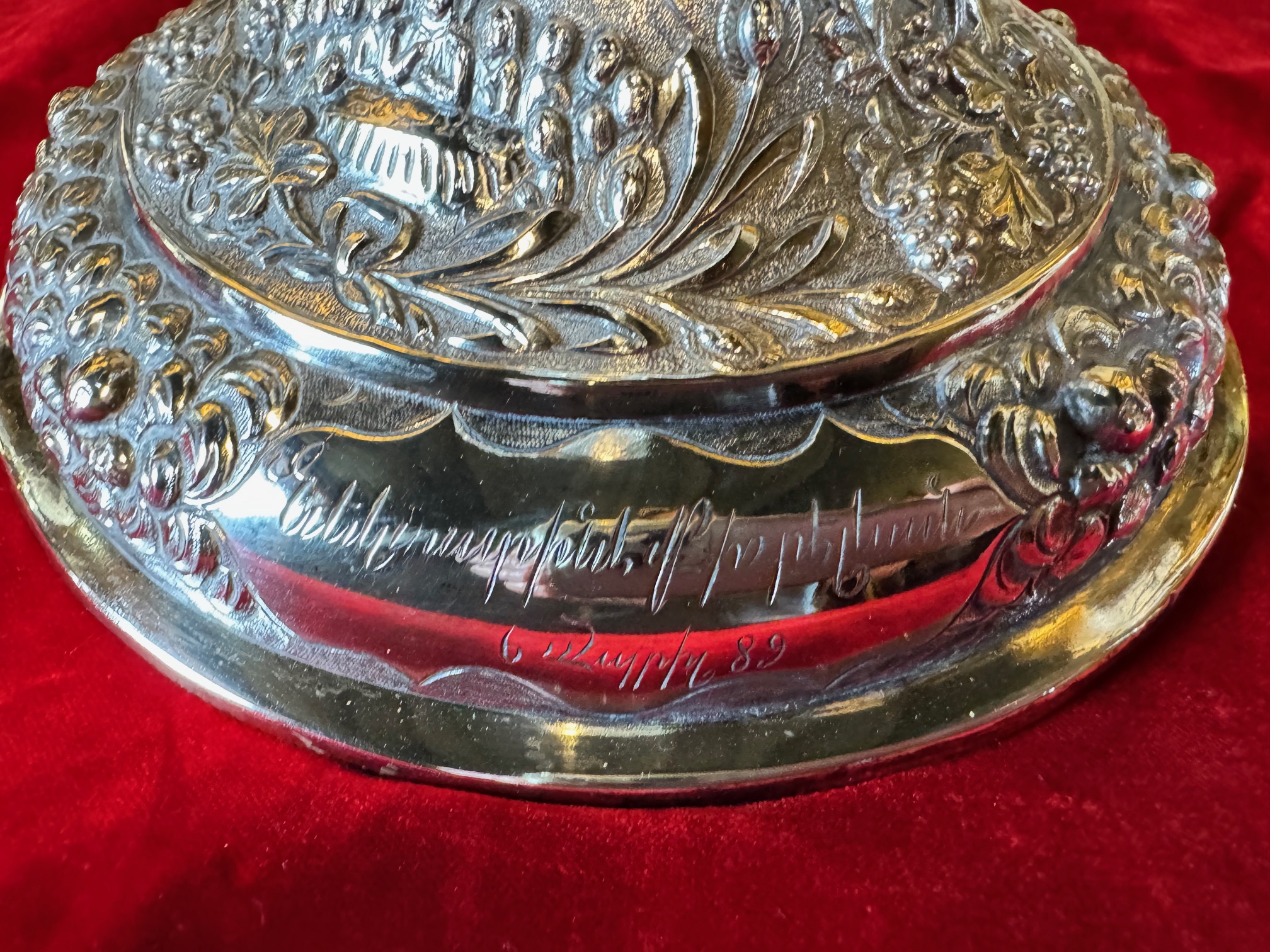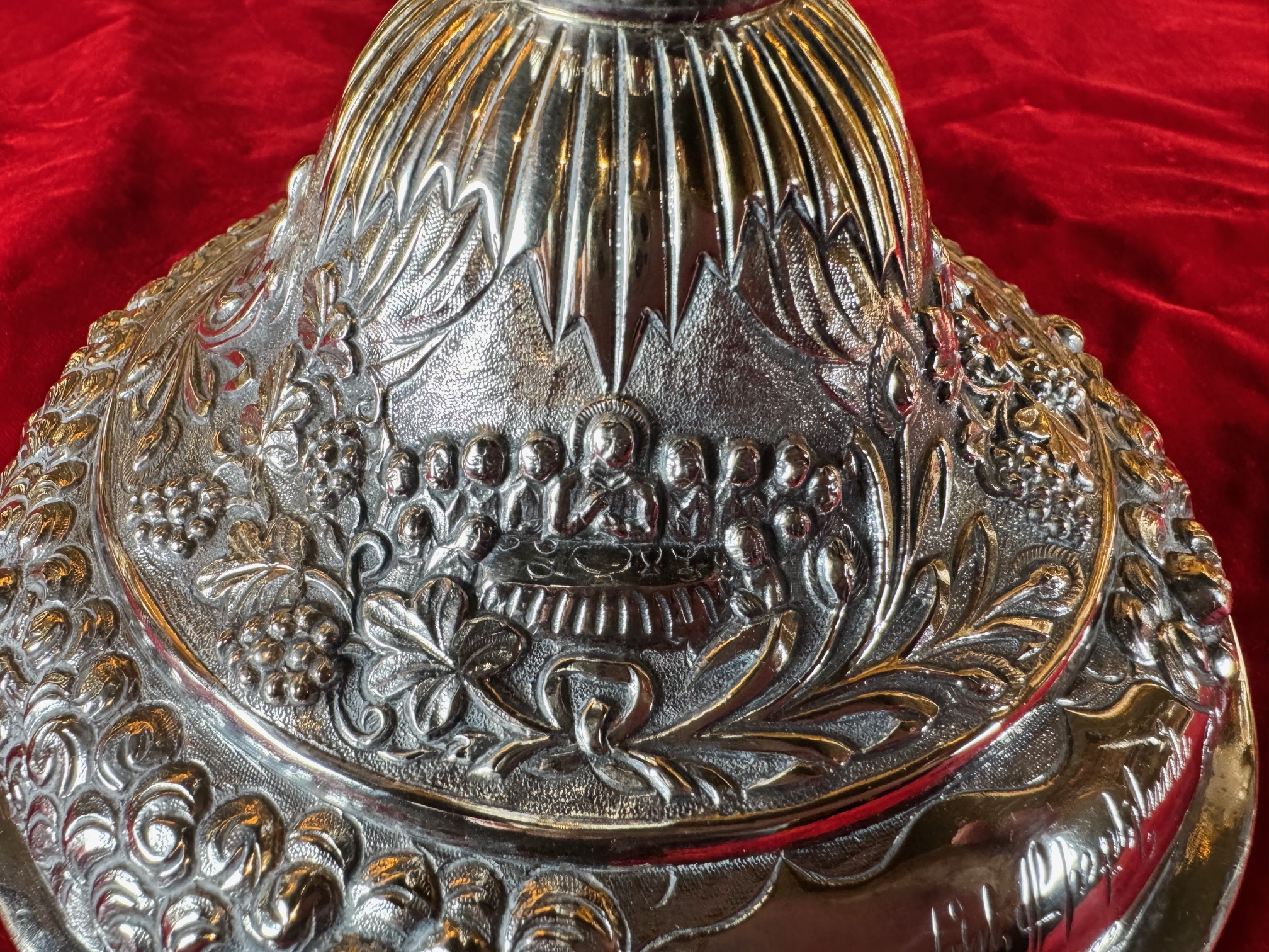 The circular base is decorated with a delicate frieze of cherubs in a cloud. The foot is adorned with Eucharistic symbols as well as three rare depictions: Christ in the Garden of Gethsemane, the Last Supper, and the Entombment. A cartouche bears the Armenian inscription: Negdariné Koupélian, April 6, 1889. Dimensions: 31 cm, weight: 698 grams.