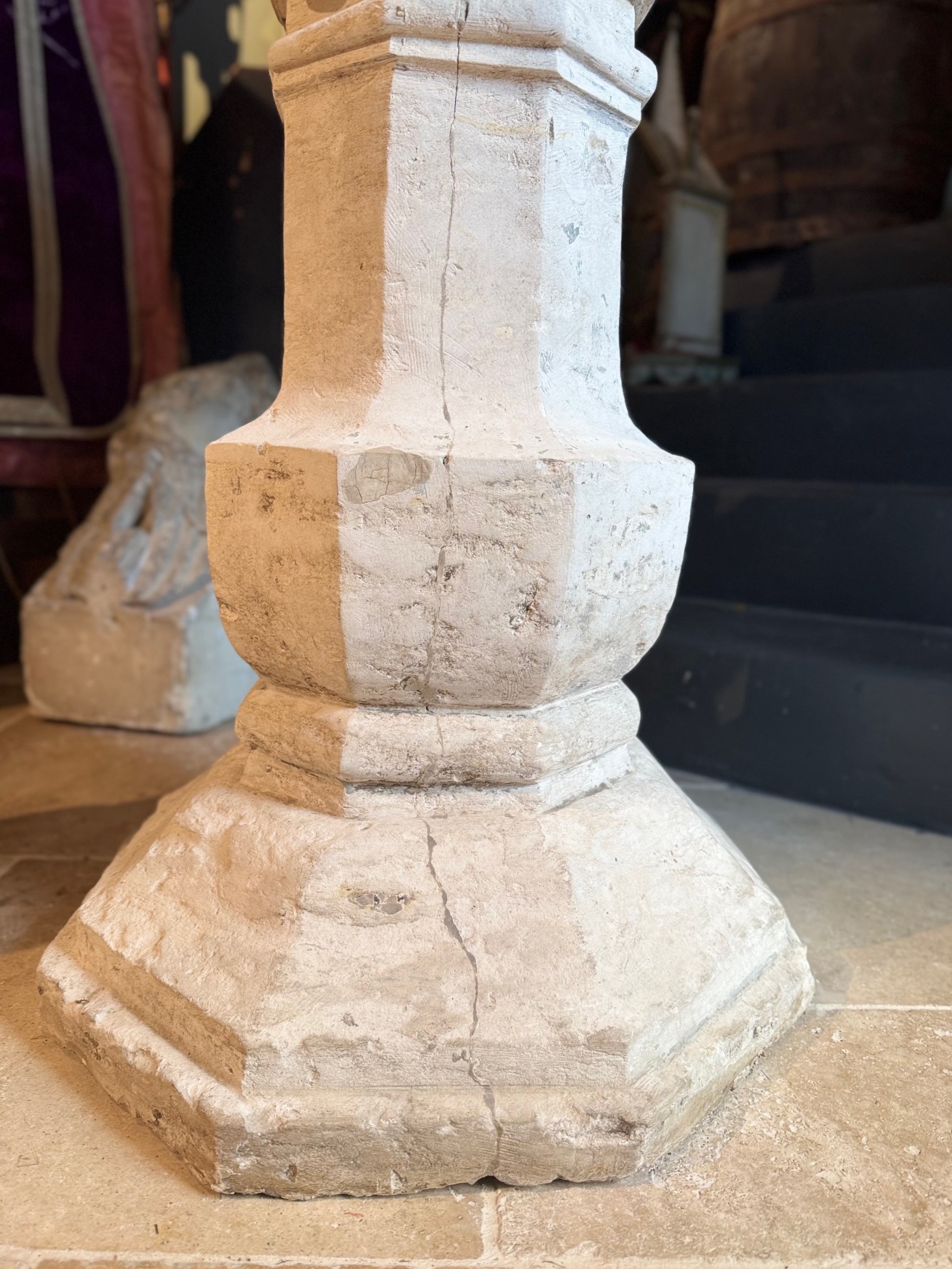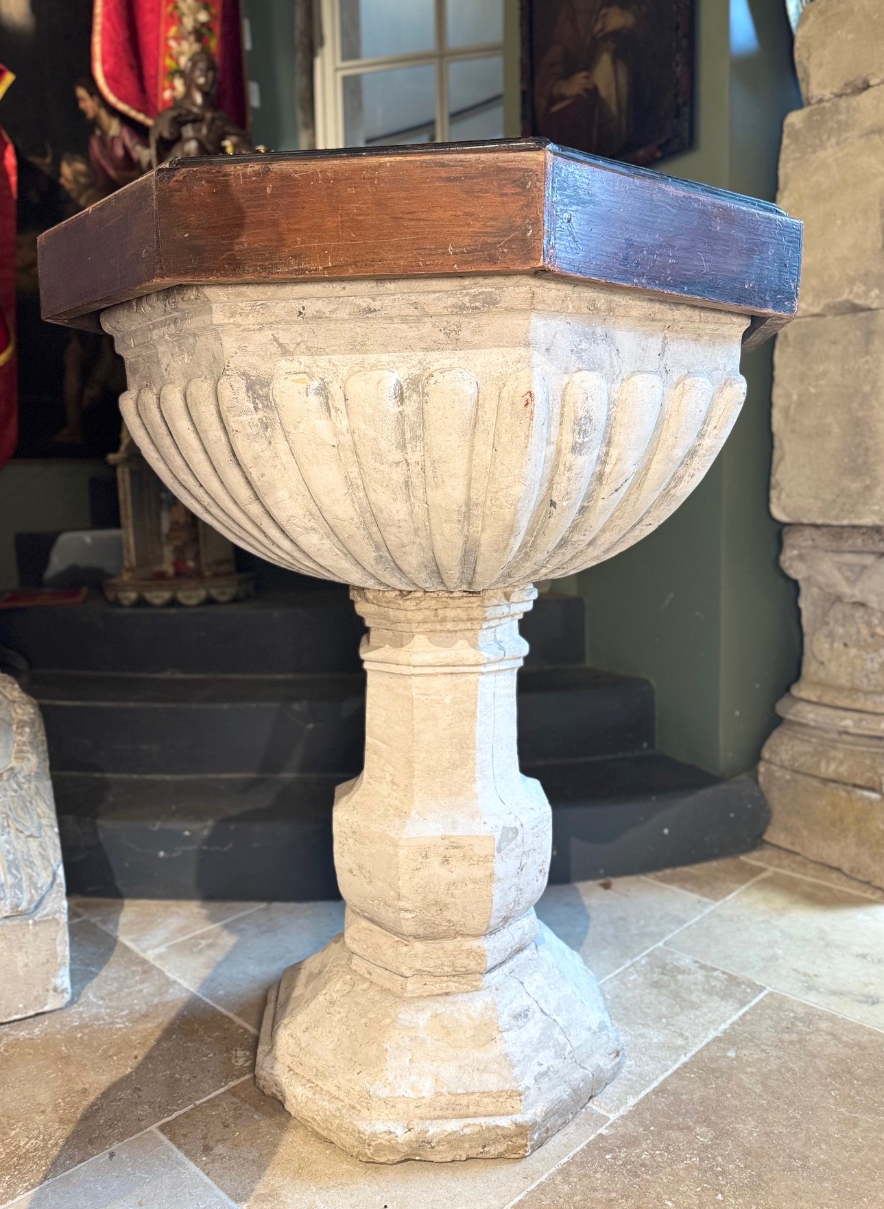 Octagonal, as it should be! This massive baptismal font, made of limestone, dates from the late 16th to early 17th century. Sculpted with gadrooned decoration, it rests on a large console-shaped base. It is offered with its rare bronze and wooden lid.
