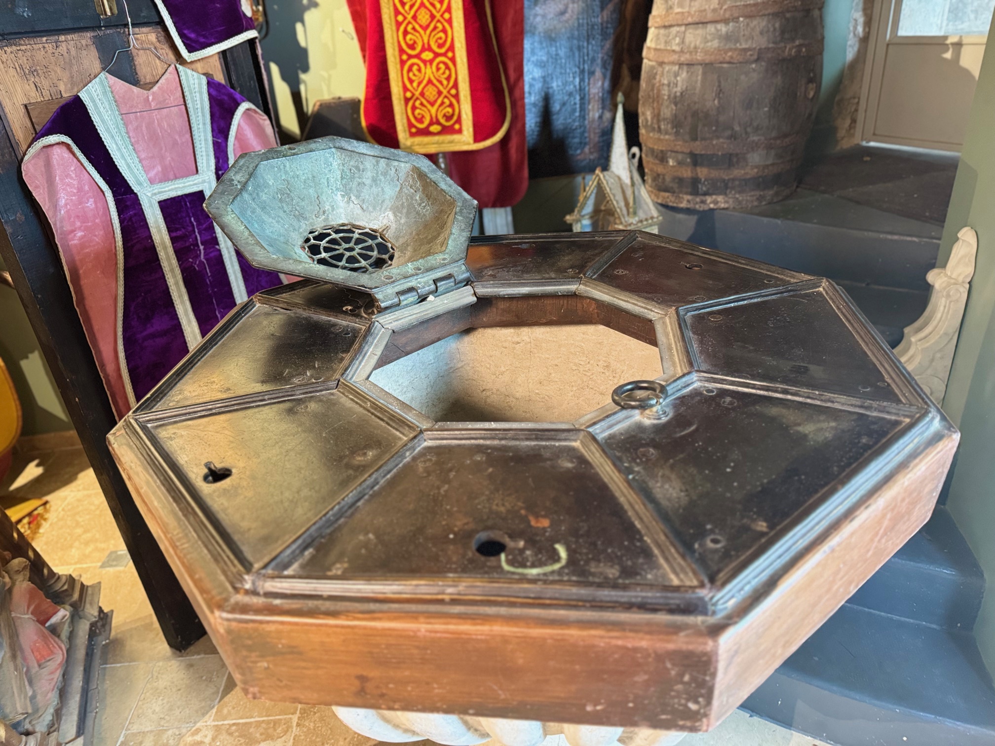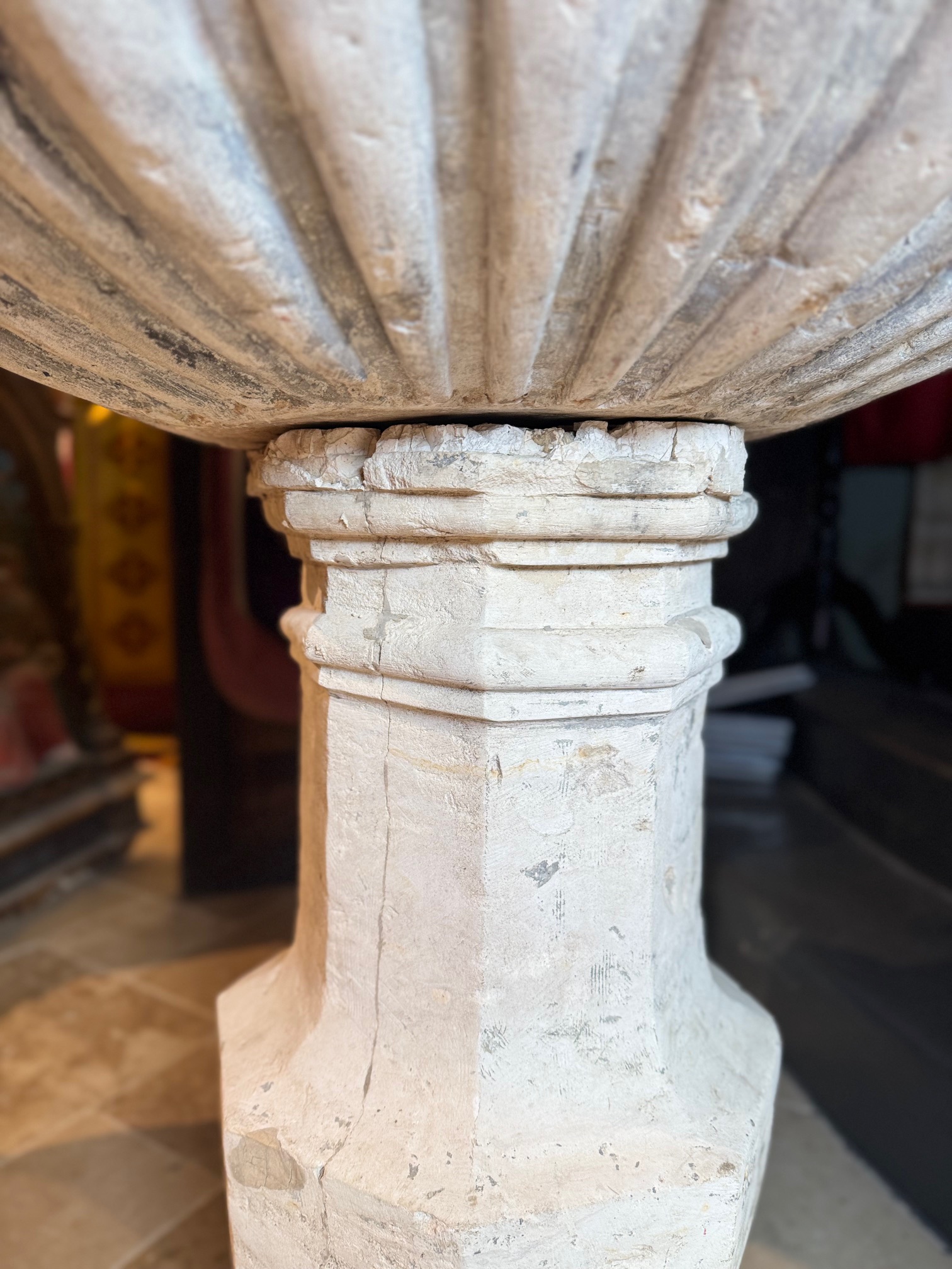 Octogonale comme il se doit ! Cette cuve baptismale massive, en pierre calcaire, date de la fin XVIe - début XVII.