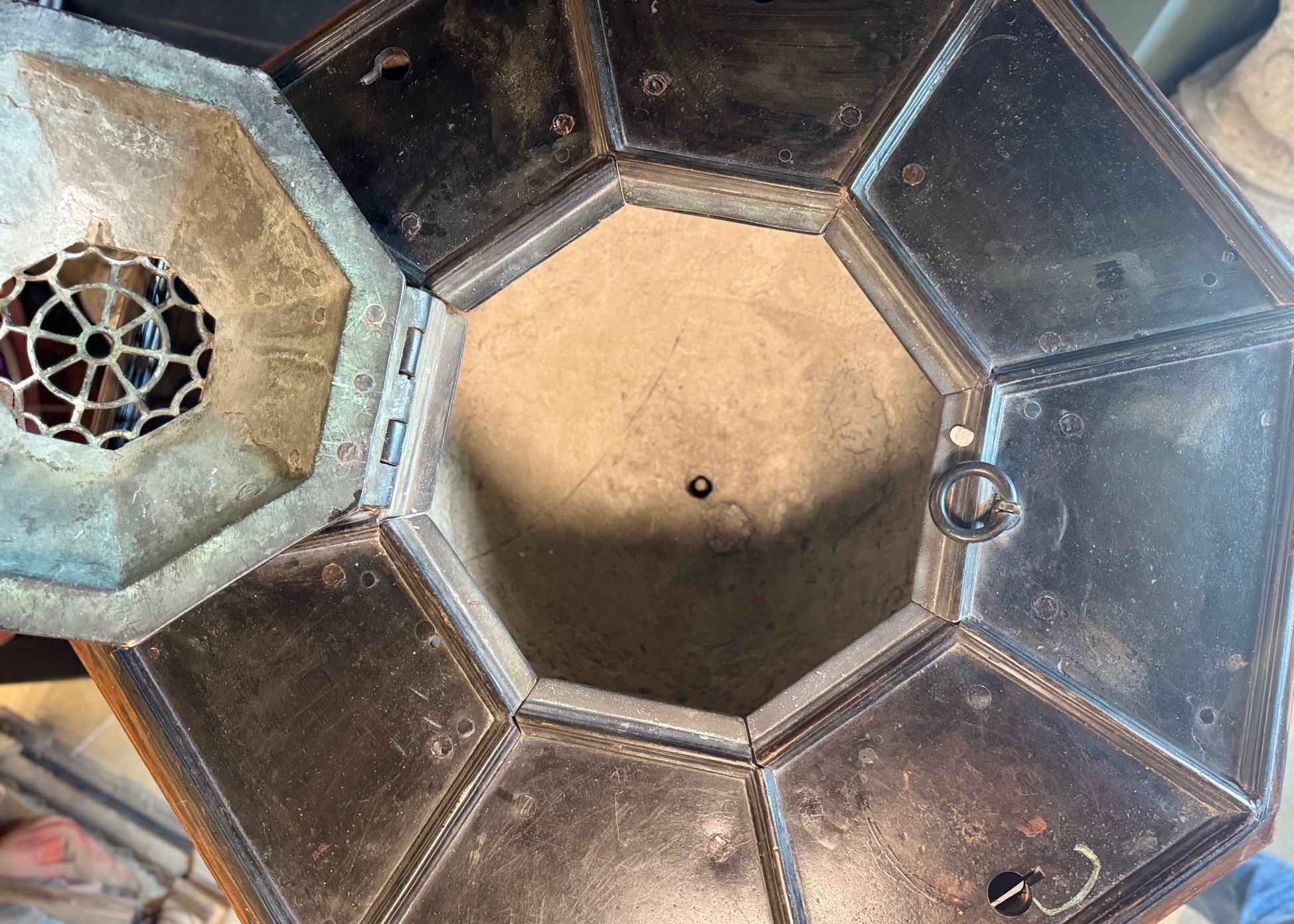 Elle est proposée avec son rare couvercle en bronze et en bois. Un travail probablement Espagnol du XVIIIe pour cet imposant couvercle de cuve baptismale qui épouse parfaitement le baptistère.
