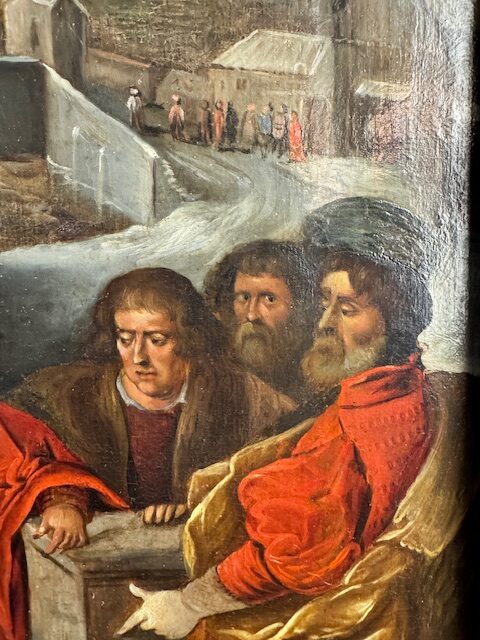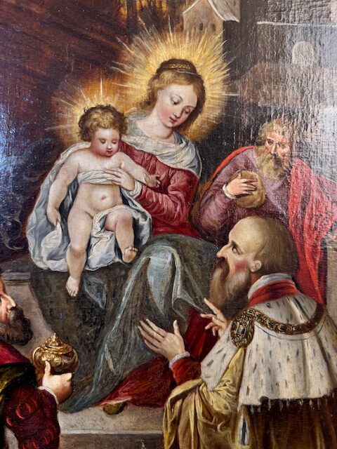 Ecole flamande vers 1630 dans l’entourage de Frans FRANCKEN (1581-1642). Une douce scène que celle des mages, déposant leurs attributs royaux au sol avant de s’incliner devant l’Enfant en Gloire. Si toute iconographie religieuse est empreinte d’espérance et d’amour, les représentations de la Passion - le Christ aux liens, l’Ecce Homo, le Christ à la colonne, portement de croix, Crucifixion ou encore Descente de croix - expriment une douleur poignante, dont les scènes de Nativité sont ici préservées. Notre huile sur toile est en bel état et provient de la collection Foinet. Elle est présentée dans un élégant cadre en bois doré et sculpté.