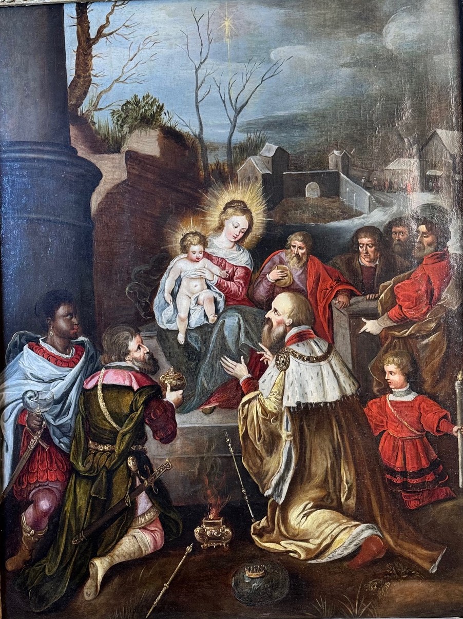 Flemish school circa 1630 in the circle of Frans FRANCKEN (1581-1642). A sweet scene of the Magi, laying their royal attributes on the groundbefore bowing to the Child in Glory. While all religious iconography is imbued with hope and loverepresentations of the Passion - Christ in bonds, Ecce Homo, Christ at the columncolumn, the carrying of the cross, the Crucifixion and the Descent from thethe Crucifixion and the Descent from the Cross - express a poignant sorrow, which theNativity are preserved here. Our oil on canvas is in fine condition and comes from the Foinet collection. It is presented in an elegant gilded and carved wooden frame. Dimensions 65.5 cm x 50 cm A work appraised by René Millet