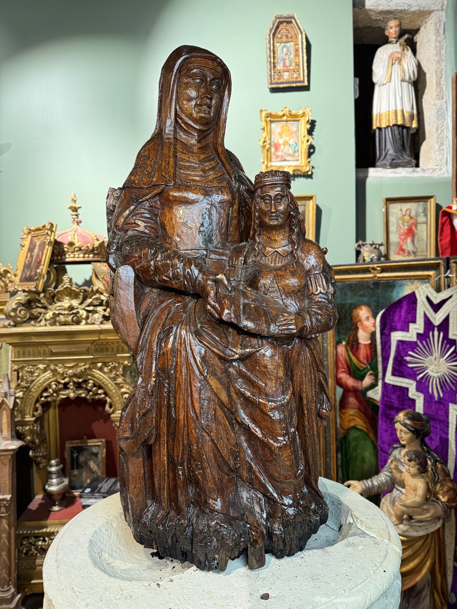 This is an imposing representation of folk art, but full of grace, where Saint Anne delivers pious and moral instruction to her daughter. A work from the Rhine or Flemish, from the end of the 16th or the beginning of the 17th century.