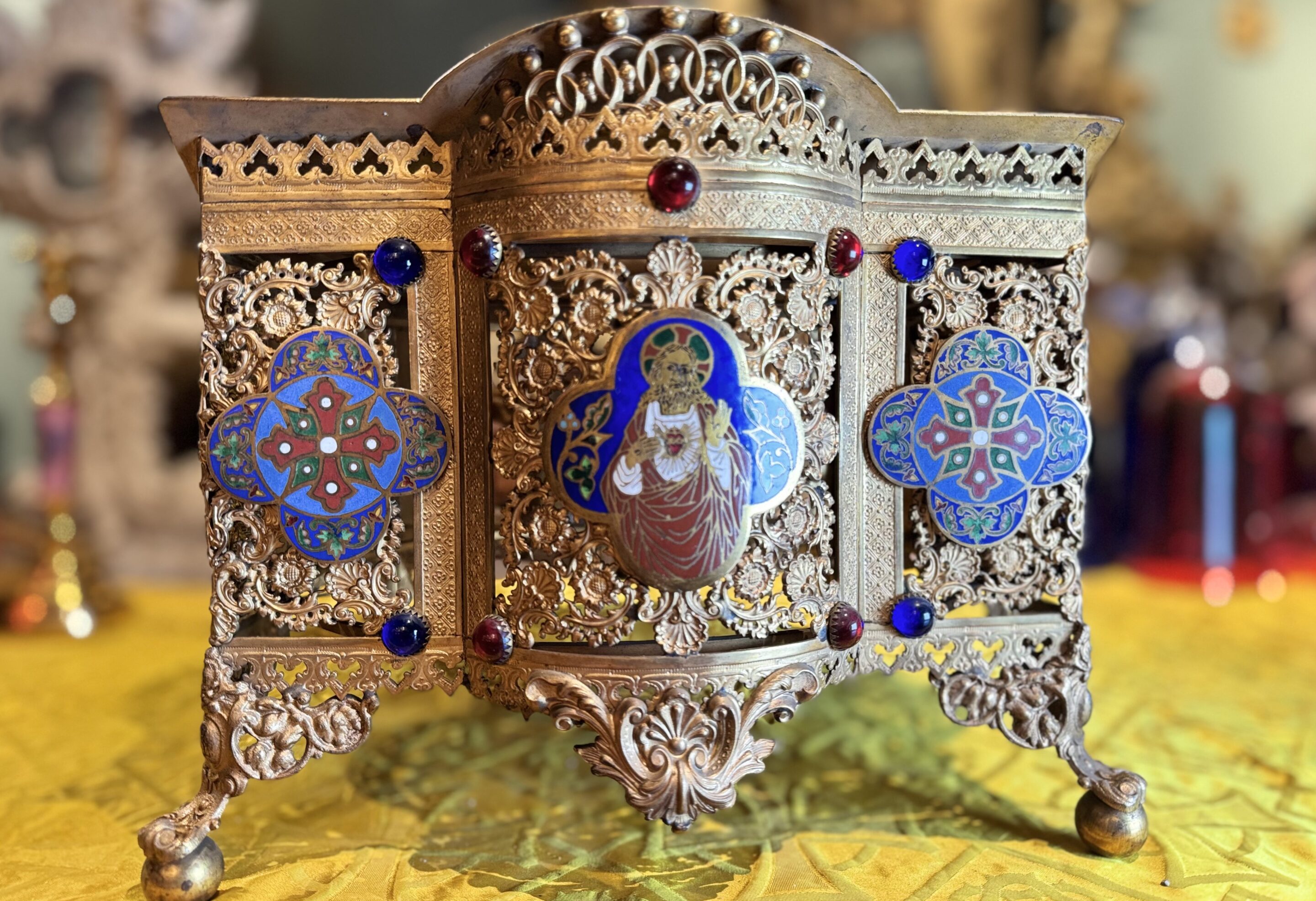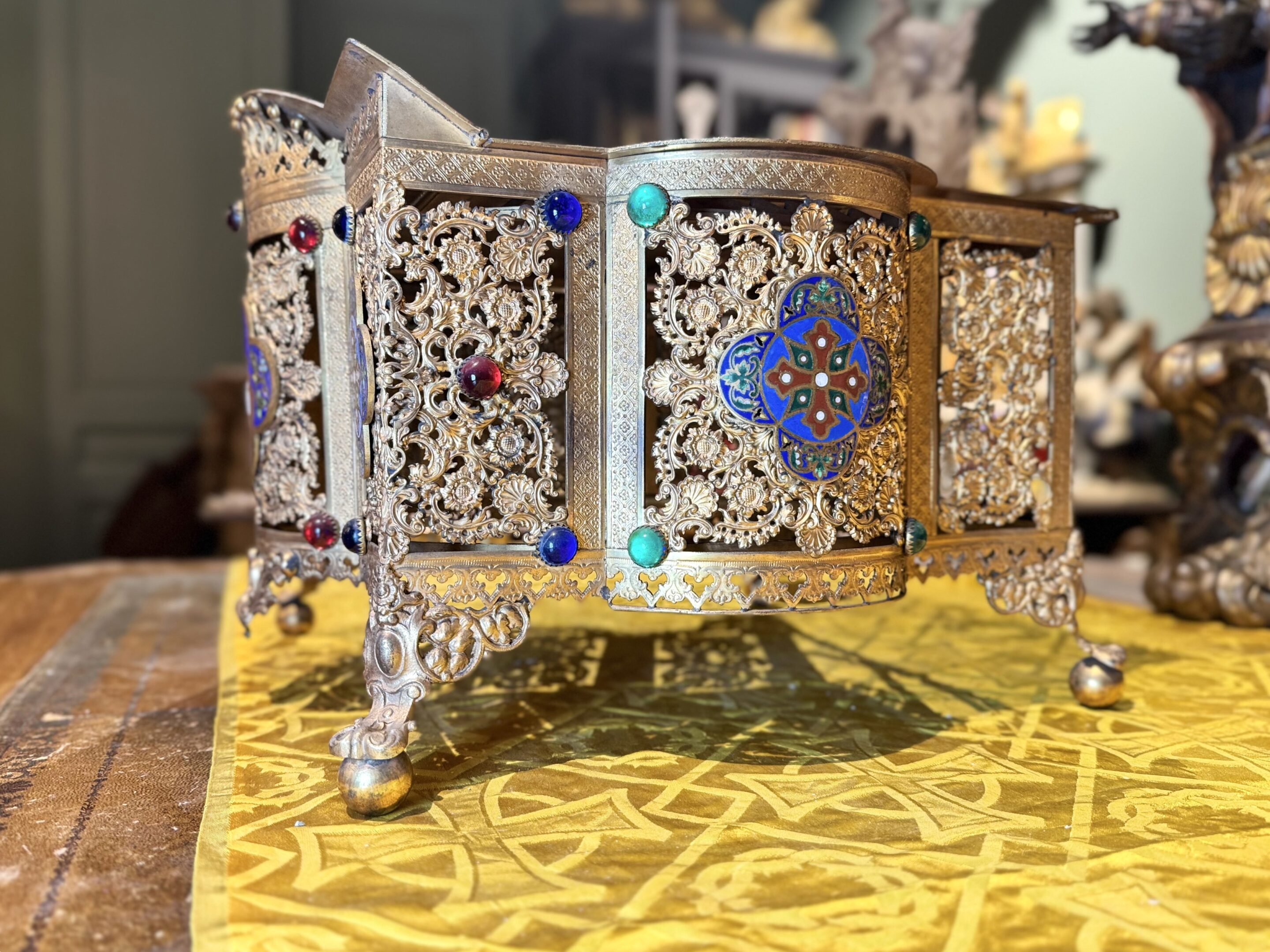A richly openwork and chased Neo-Gothic bronze work, resting on four feet adorned with stylized foliage. The body is decorated with polychrome enameled quatrefoil panels, set with cabochons of colored glass in red, purple, and green, within a frame of finely crafted Gothic arcades. The sloping top features a painted fleur-de-lis cross surrounded by stars. A high-quality piece reminiscent of 19th-century religious metalwork. Good condition – some stains on the top. Dimensions: 28 cm x 28 cm x 24 cm (folded).
