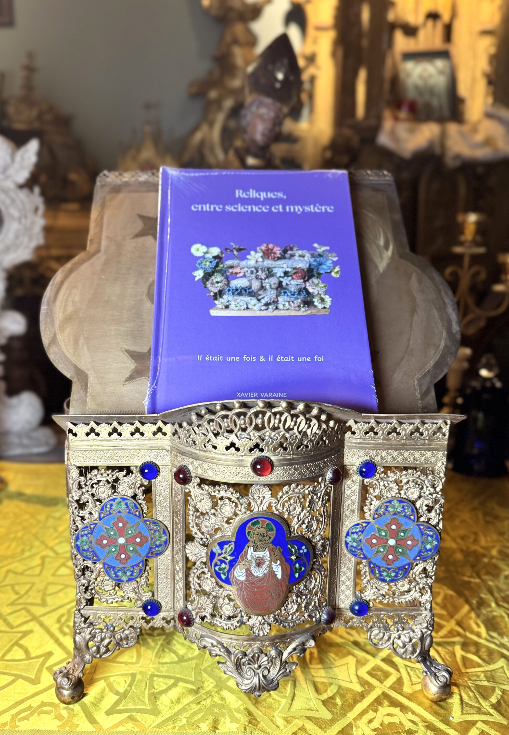 Travail néogothique en bronze richement ajouré et ciselé, reposant sur quatre pieds ornés de feuillages stylisés. Le corps est décoré de panneaux quadrilobés émaillés polychromes, sertis de cabochons de verre coloré, rouge, violet et vert, dans un encadrement d’arcatures gothiques finement travaillées. Le plateau incliné présente un décor peint d’une croix fleurdelisée cantonnée d’étoiles. Travail de qualité évoquant les productions lyonnaises d’orfèvrerie religieuse du XIXe siècle. Bel état – taches sur le plateau Dimensions de 28 cm sur 28 cm et 24 cm de hauteur (replié) Référence 838