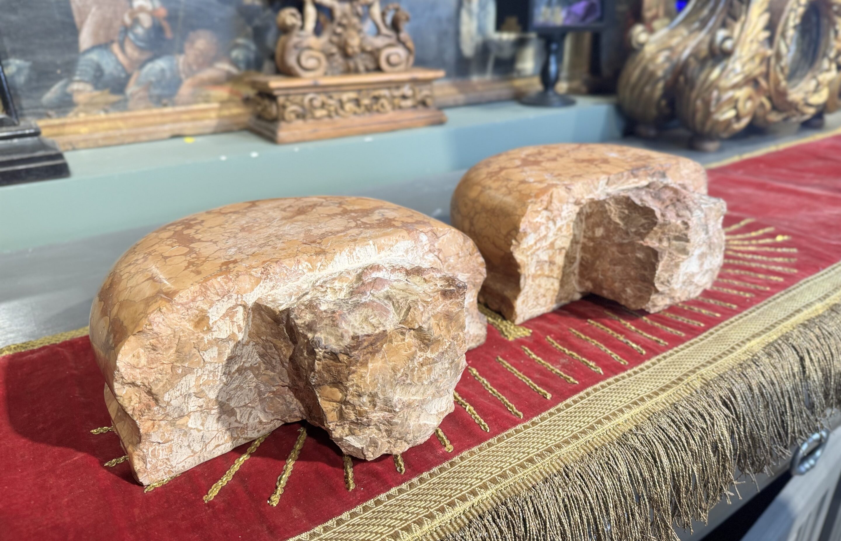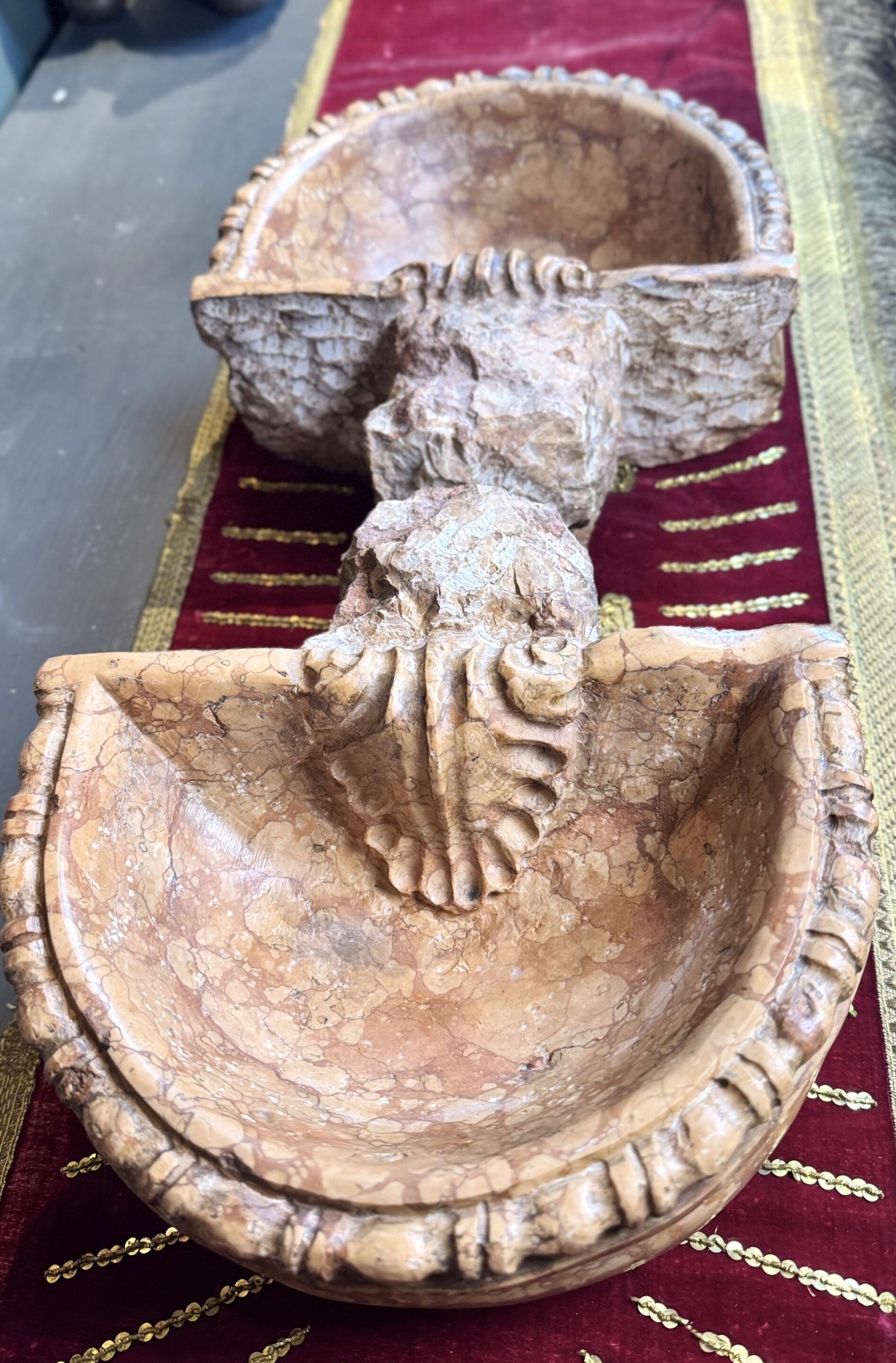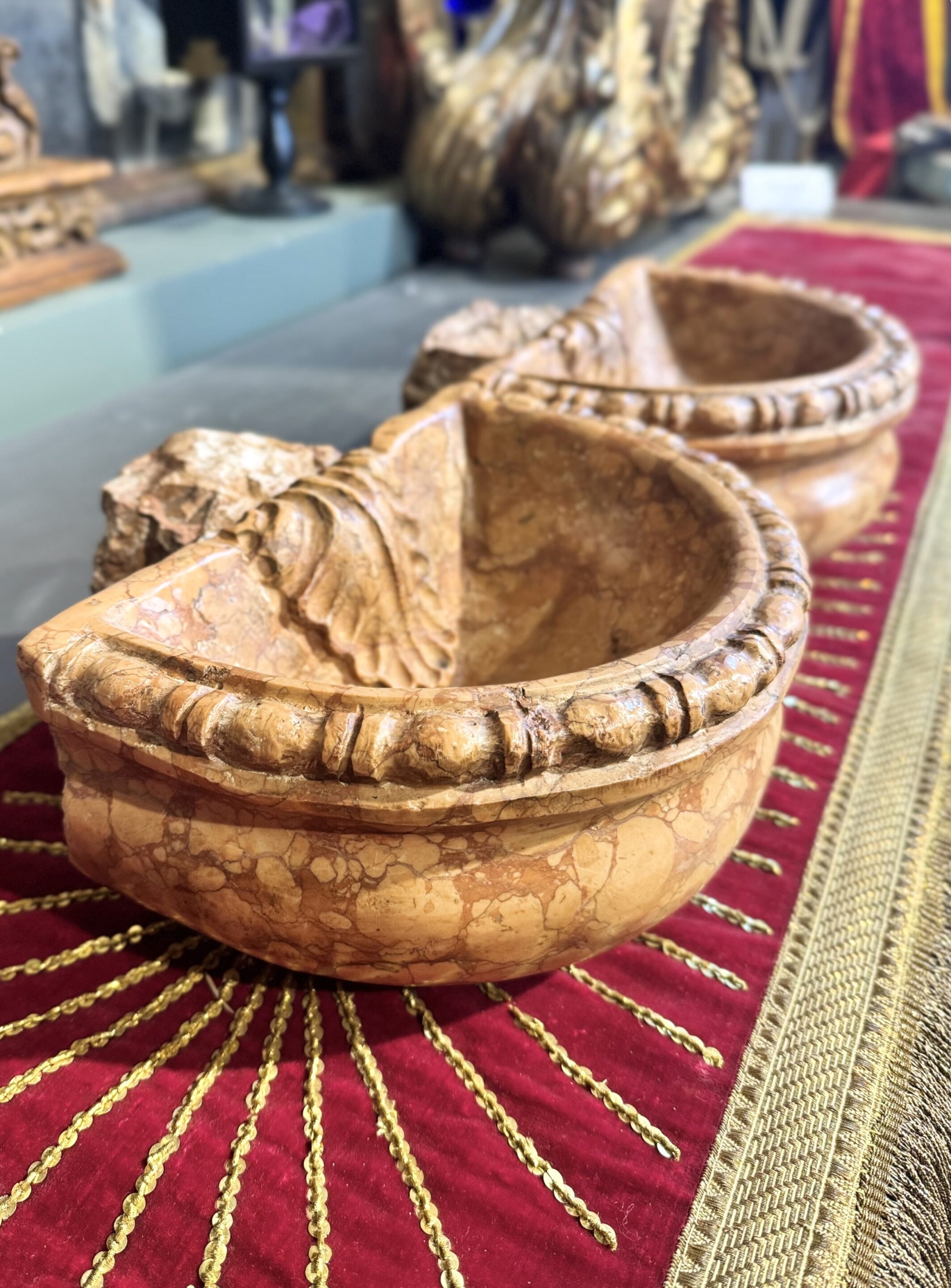 Ces charmants bénitiers en marbre rose et joliment veinés nous viennent d’une chapelle italienne.