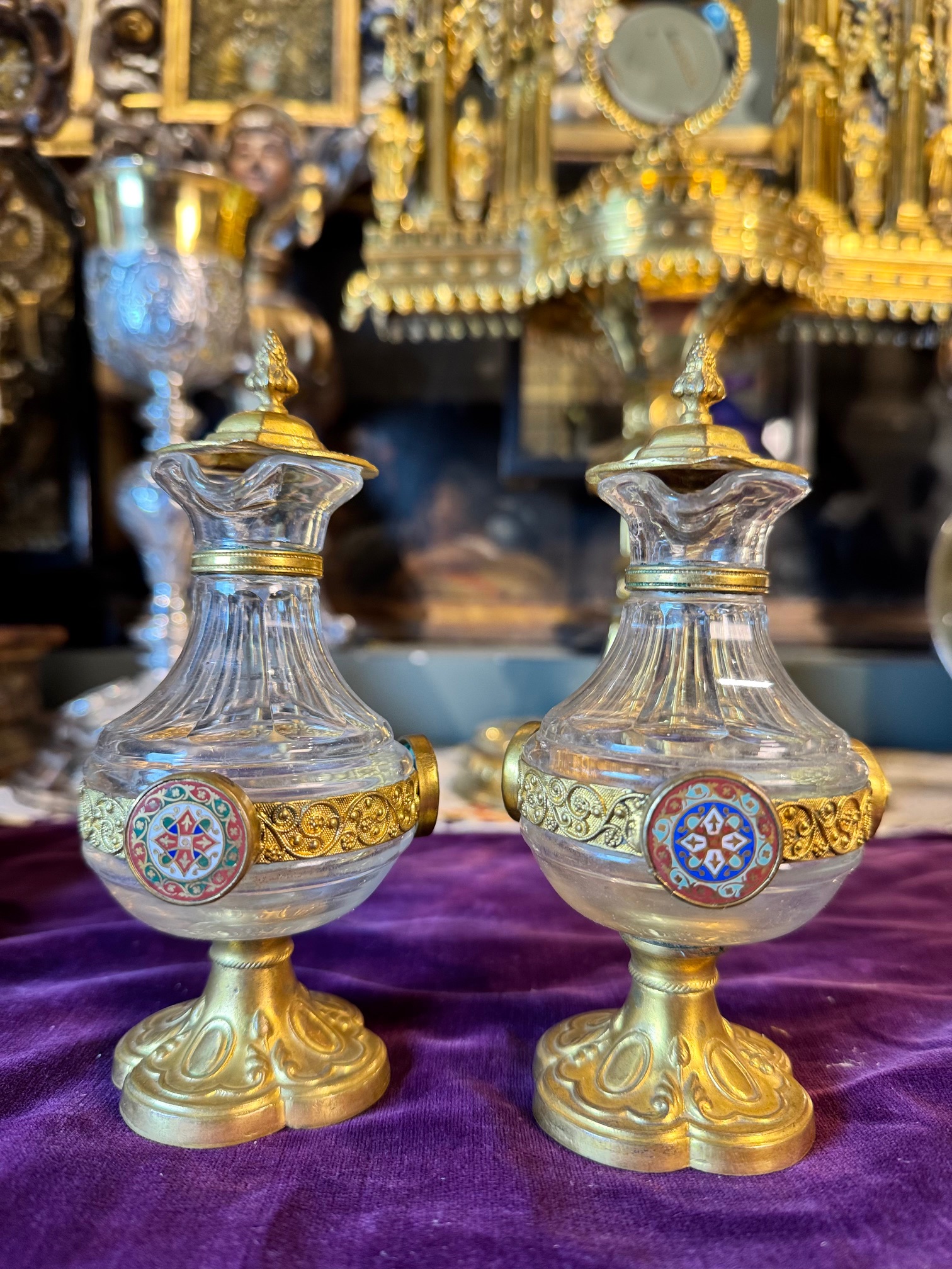 En verre taillé et monture en bronze doré portant des émaux. Le lavabo polylobé en bronze doré est également à décor d'émaux, dans un coffret gainé cuir, fatigué, aux initiales AC. Lavabo de 26 cm - Burettes de 13 cm - Coffret de 30 cm sur 20.