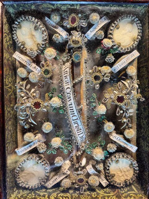 Le supposé Saint Clou, en position centrale, dispose d’une belle cédula latine. Il est entouré de huit (le chiffre du Christ) Saints Martyrs des premiers siècles. Sont ainsi présents les Saints Isidore, Généreux, Maxim, Innocent, Honête ; Olympe, Désiré, Laurent,au milieu d’un riche montage de cannetilles dorées et argentées, de perles et de verroteries de multiples couleurs.