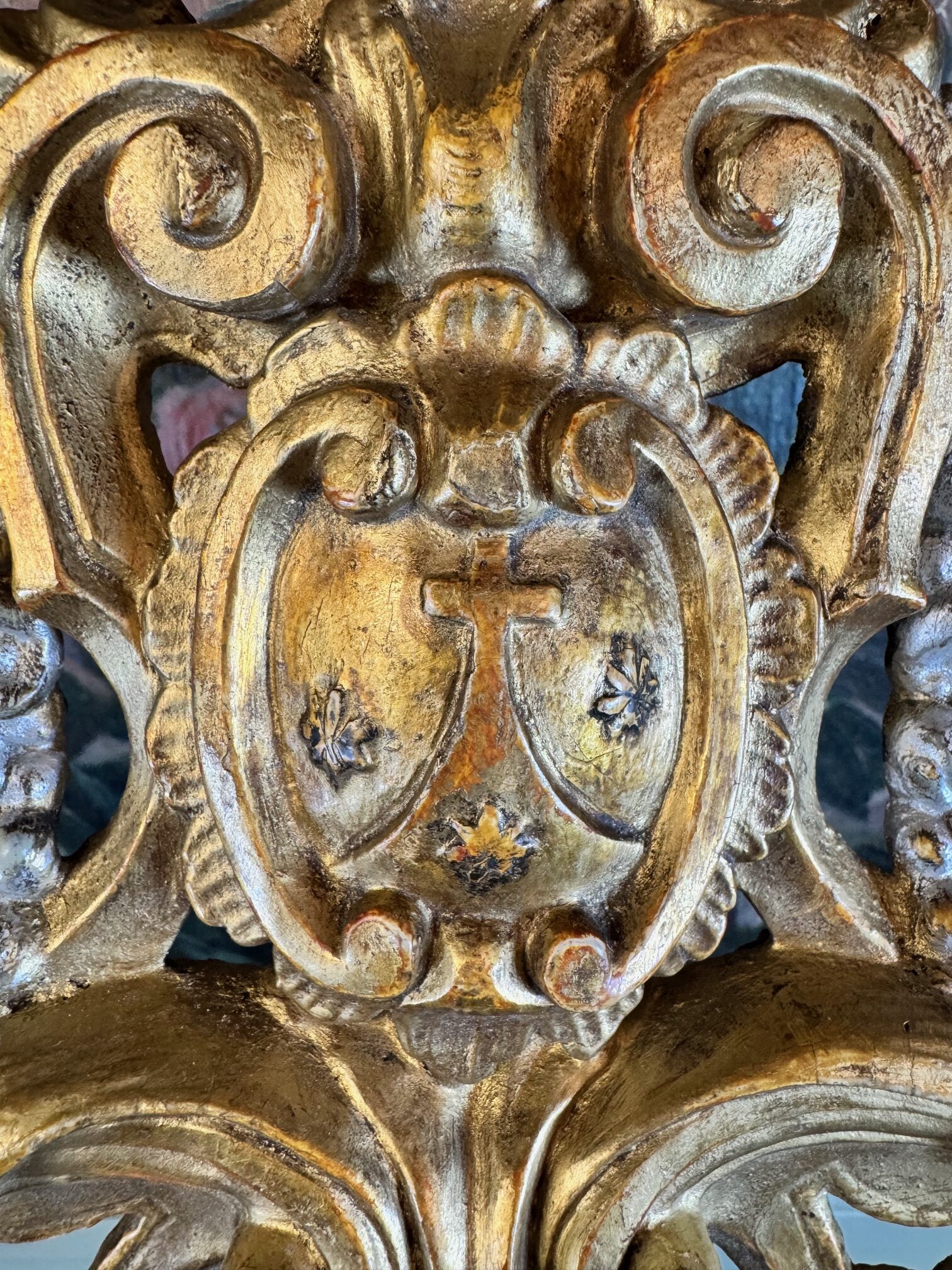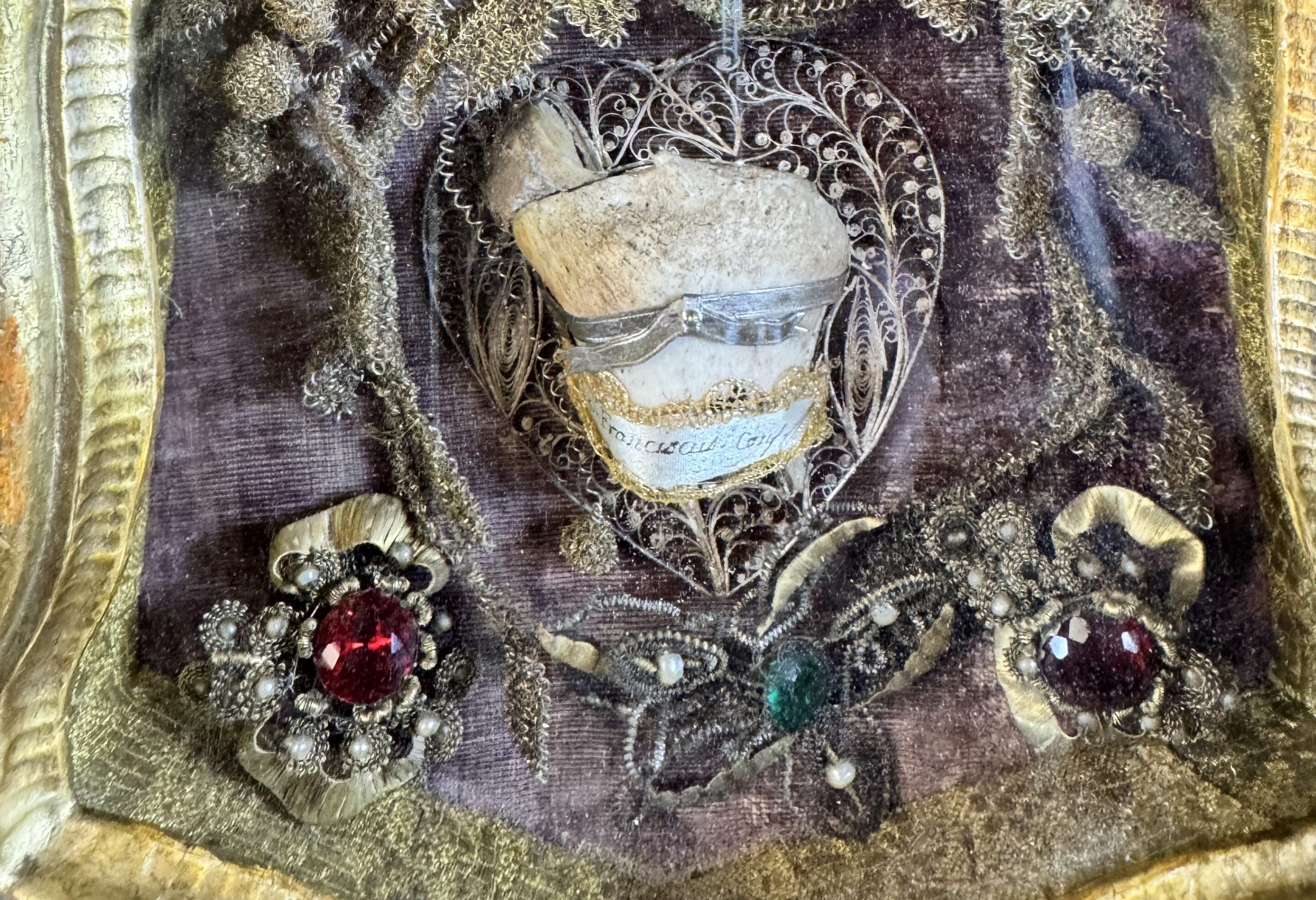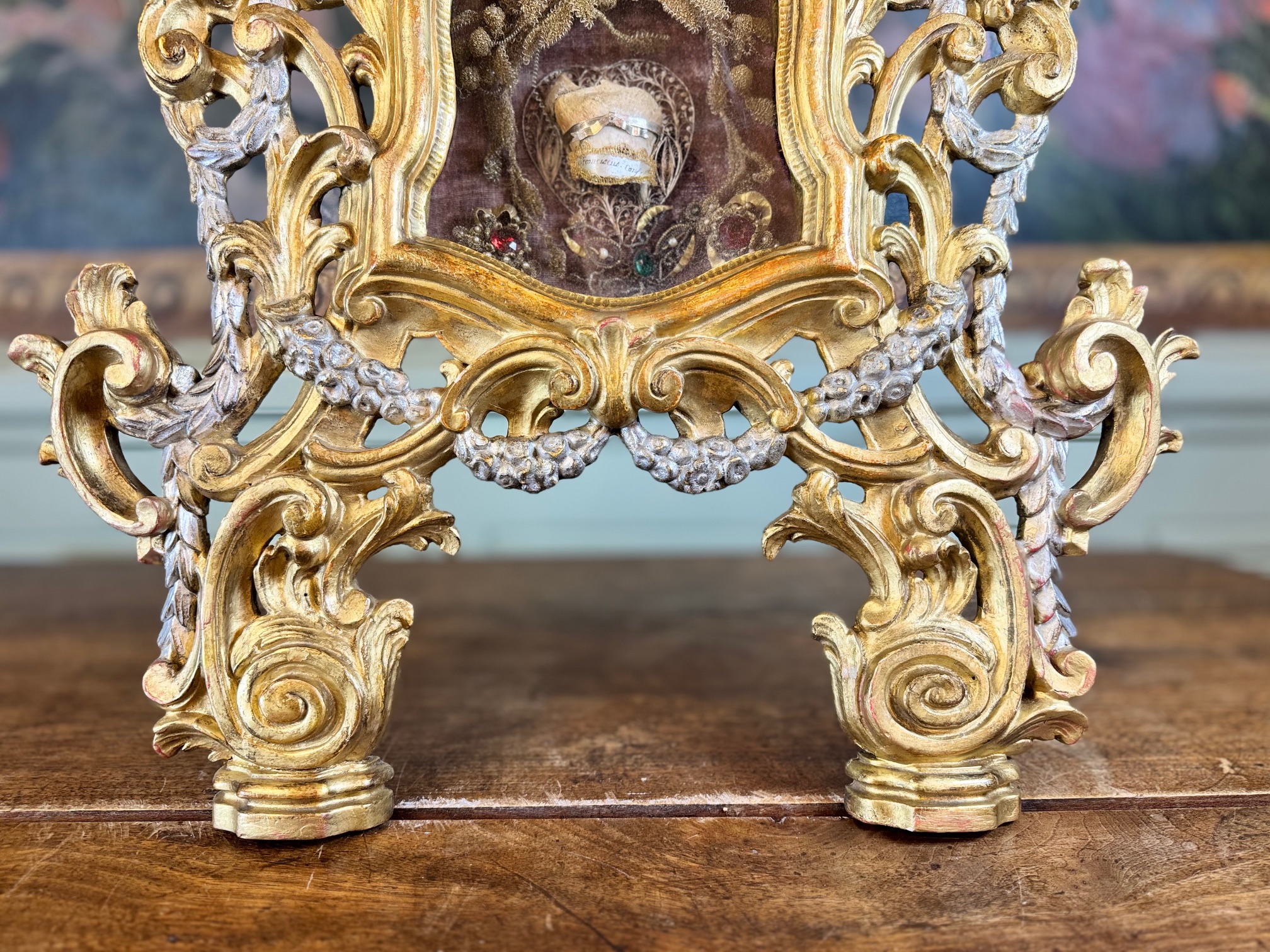 An elegant Rococo reliquary in gilt and silvered wood, finely carved, bearing the arms of the Carmelites and housing in a central niche an important ex-ossibus relic of Saint Francis, Confessor. Resting on a velvet cloth, it is surrounded by a montage of gilt cannetille, pearls, and colored glass beads.