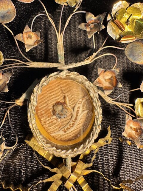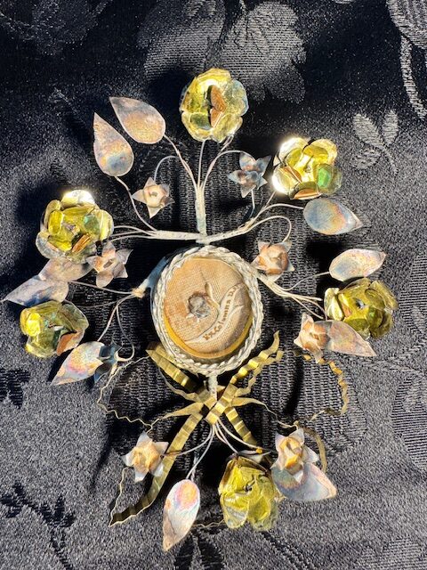Les reliques relatives au Christ sont les plus chargées. Ici, une rare relique Ex Columna D.N, pour la colonne de flagellation, est présentée à la dévotion. Elle est insérée dans une thèque en forme de couronne, entourée d’un montage à décors végétal. Présence au dos d’un sceau épiscopal Dimensions de l’ensemble de 9 cm sur 7. Référence 849