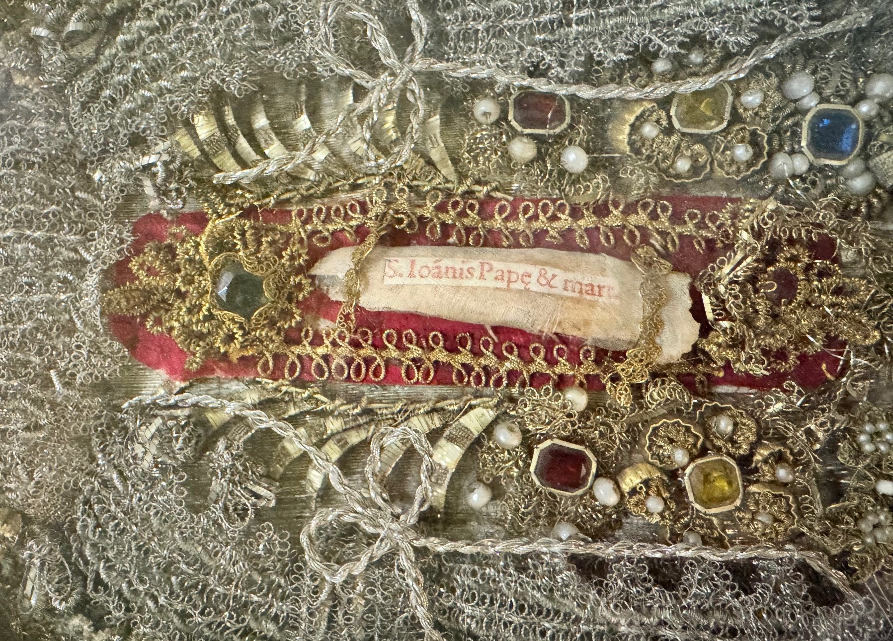 Therelic of Pope Saint John, first of the name, is surrounded by a rich montageof silver and gold cannetilles, pearls and colored glassware.