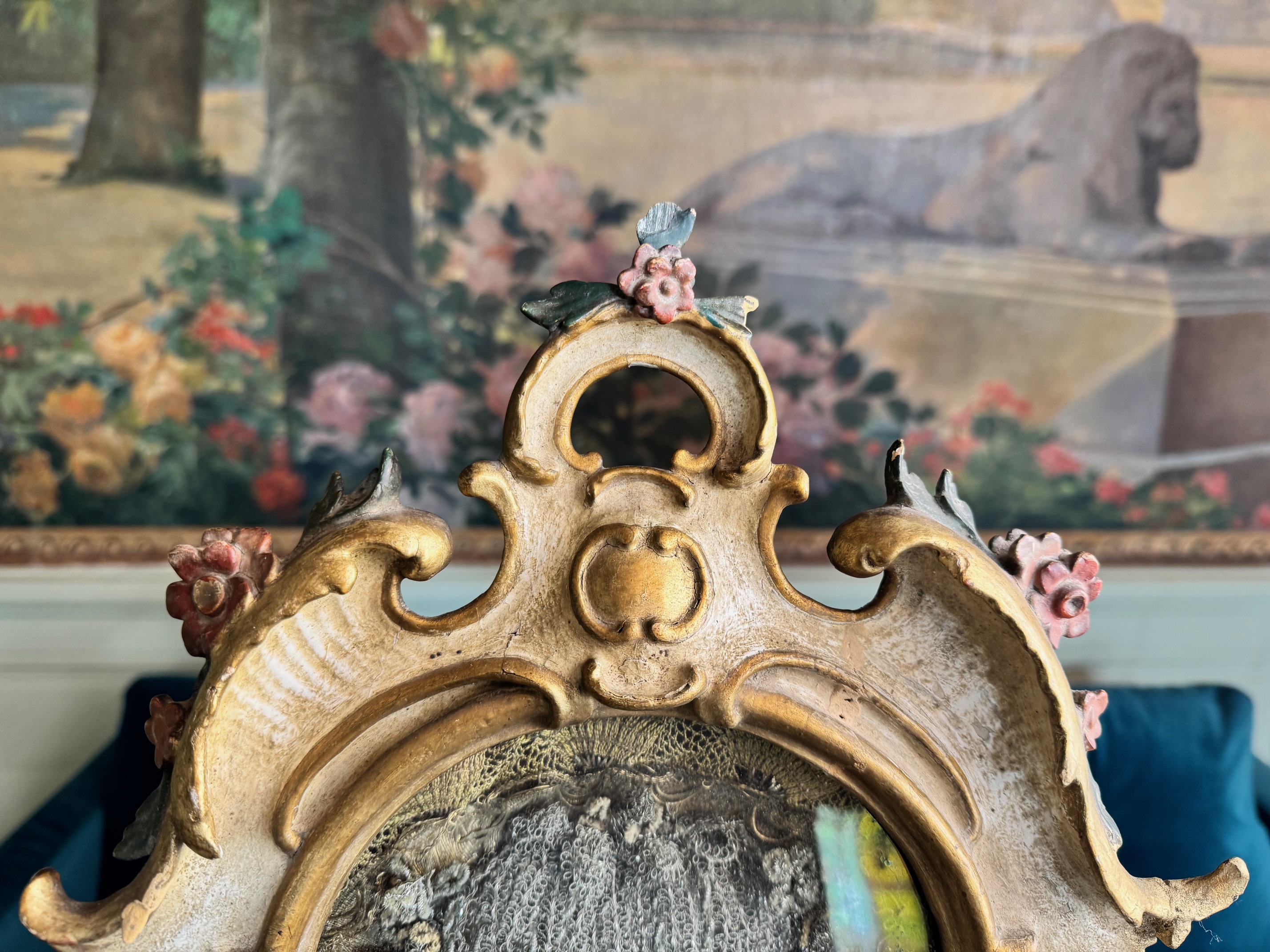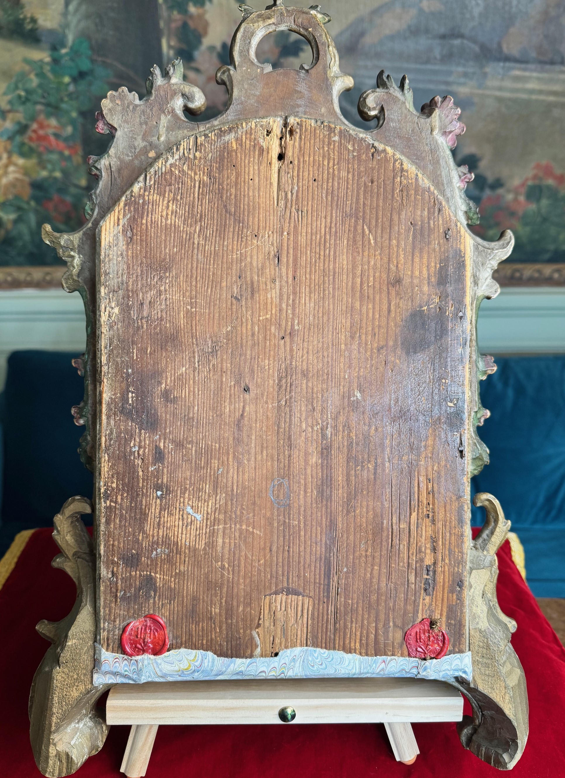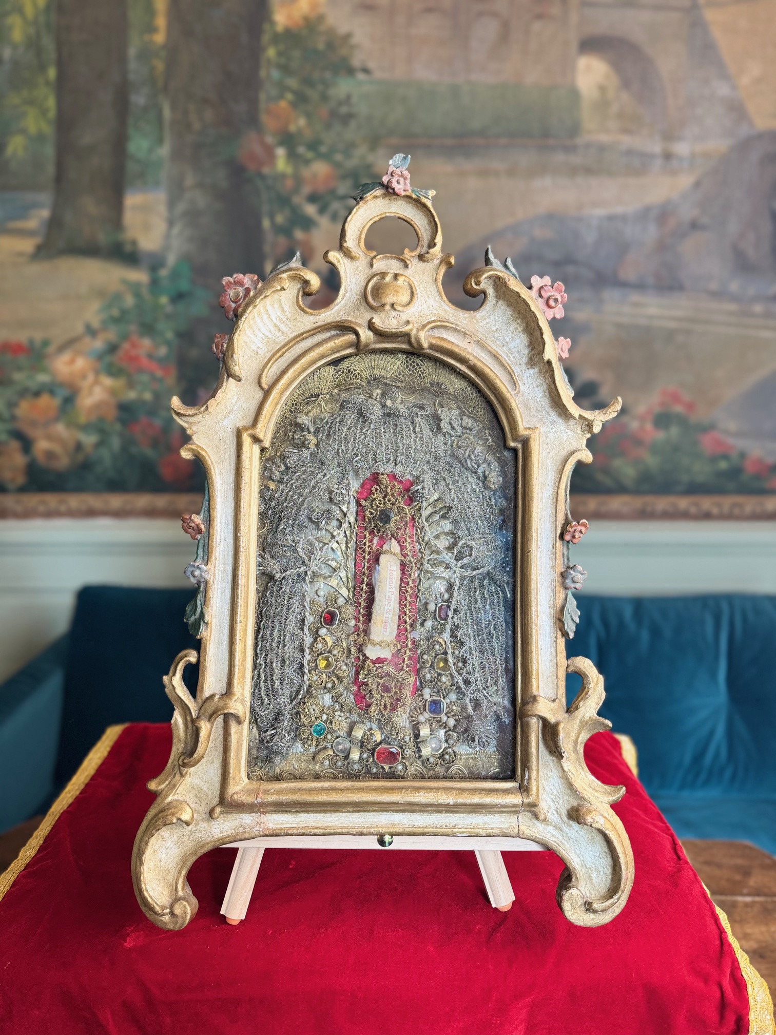 Dans un élégant cadre reliquaire en bois doré et polychrome, est offert à la dévotion une rare relique pontificale de type ex-ossibus. Cette relique du Pape Saint Jean, premier du nom, est ici entourée d’un riche montage de cannetilles argentées et dorées, perles et verreries de couleur.