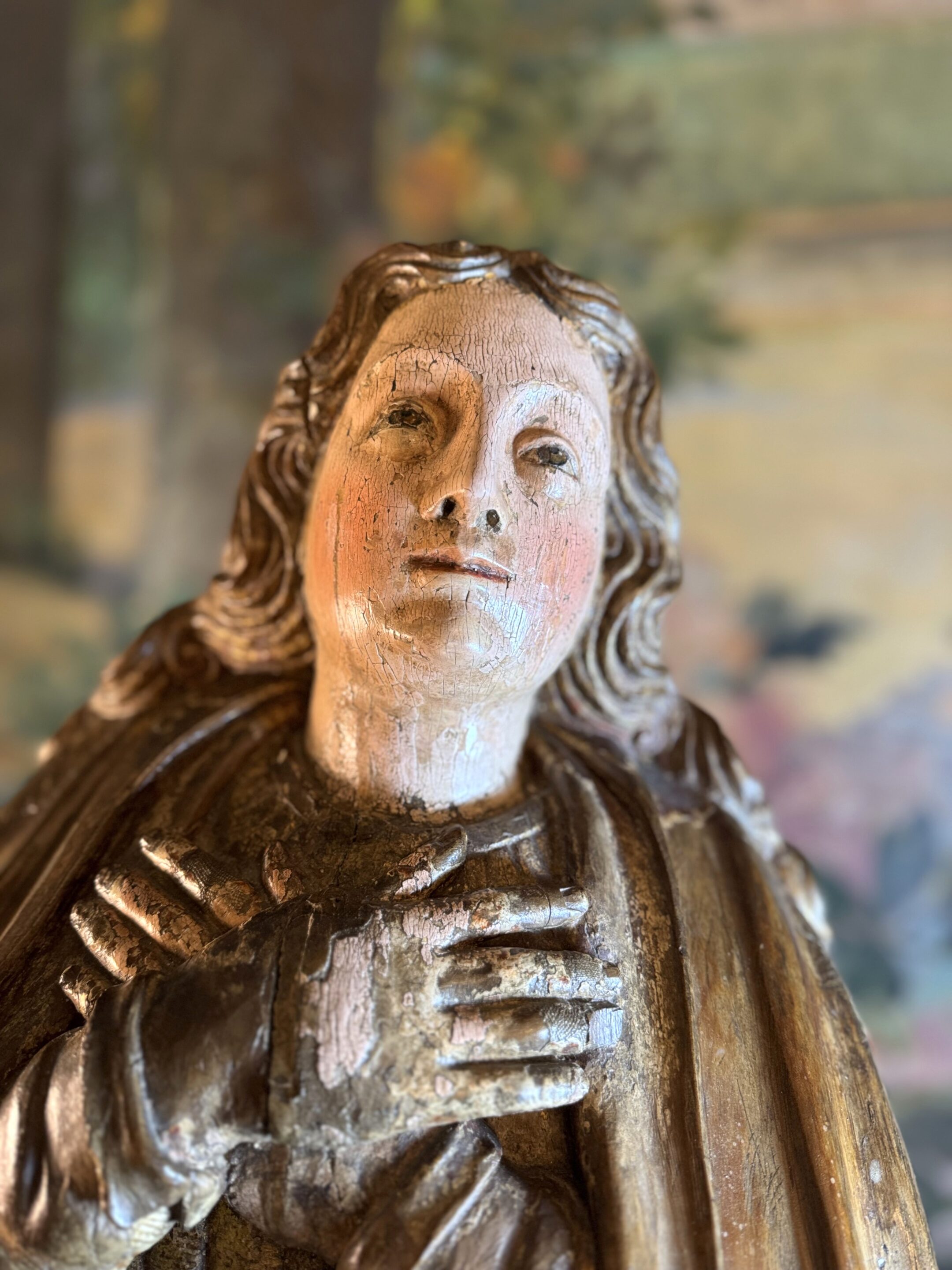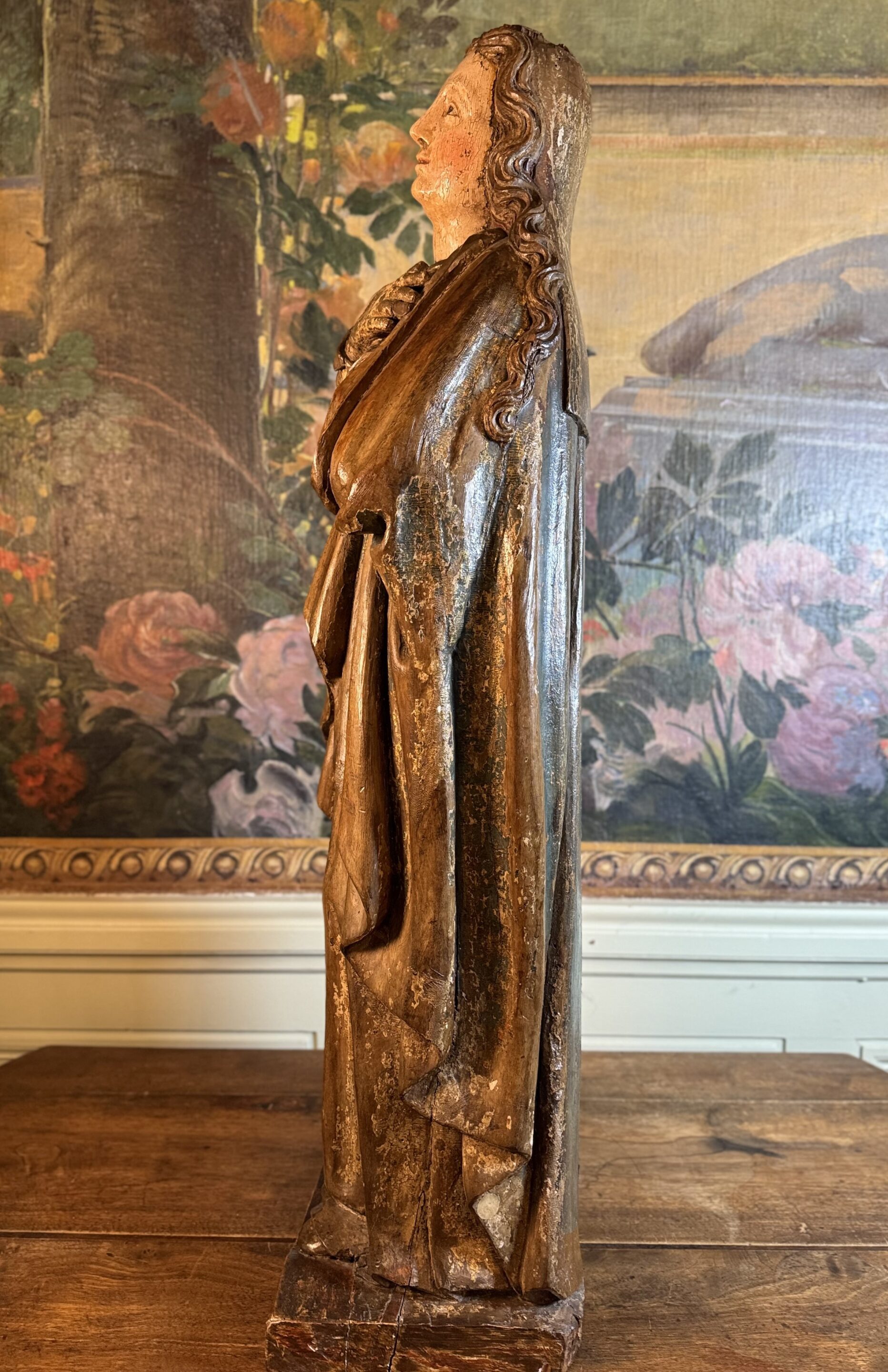 Large and elegant carved and polychromed wood sculpture from a Flemish or northern French school from the late 16th century. The finely crafted face is very gentle, almost youthful, with his hands crossed on his chest and his expression turned towards heaven.