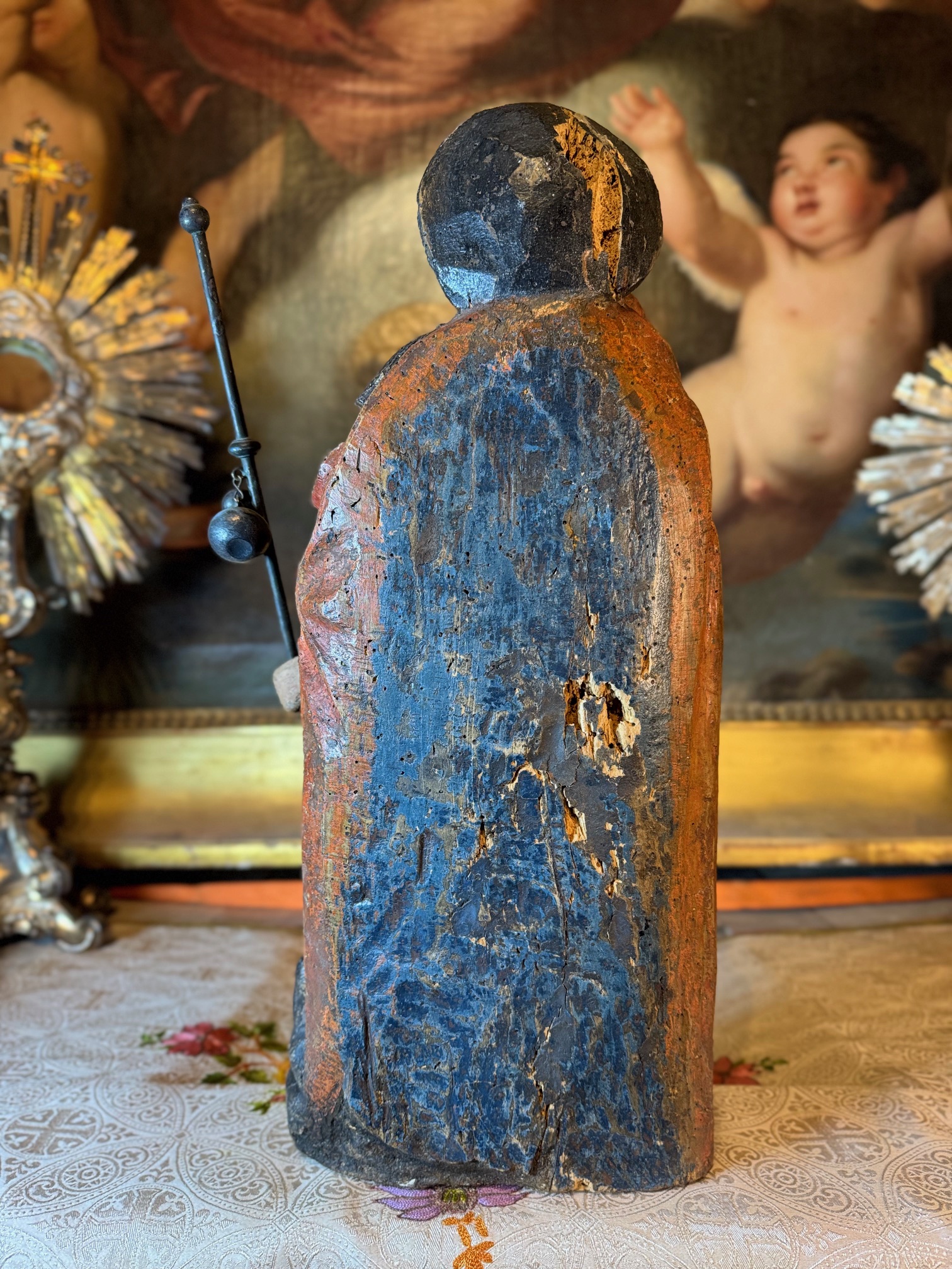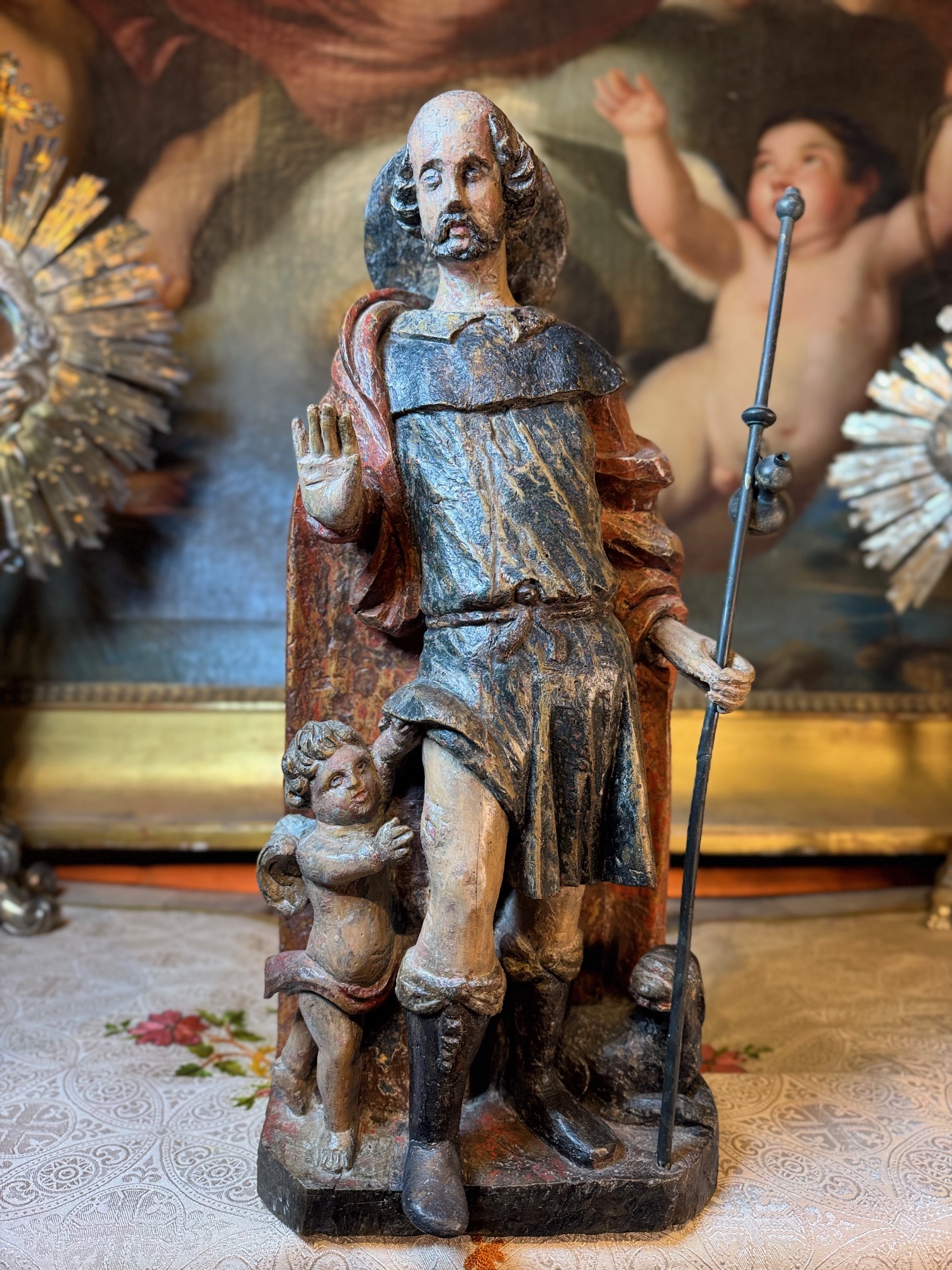A 17th-century Flemish school, in polychrome wood and with a flat back, depicting Saint Roch accompanied by an angel and his faithful dog. He is the patron saint of pilgrims and protector of animals.