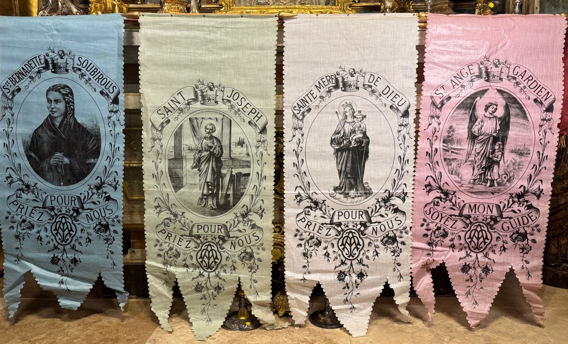 Touchante collection de quatre bannières datant du début XX, représentant La Vierge à l’Enfant, Saint Joseph, Sainte Bernadette Soubirous et un ange protecteur.
