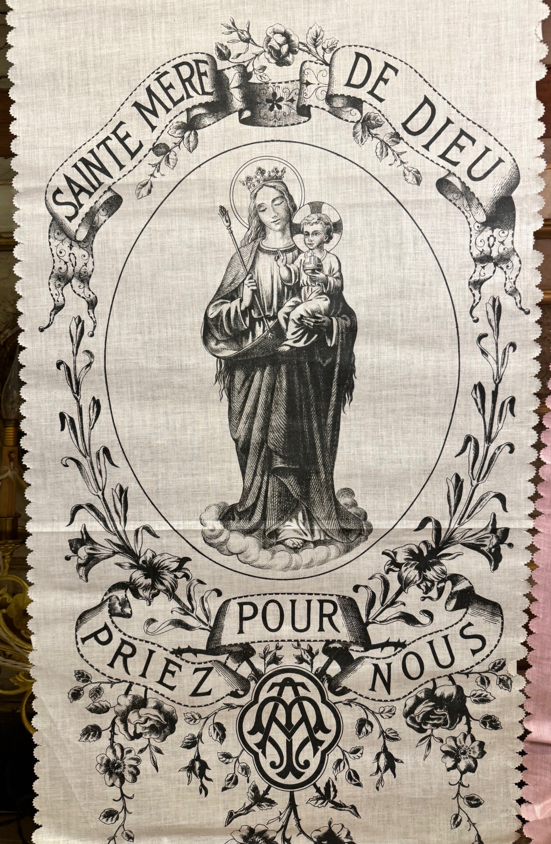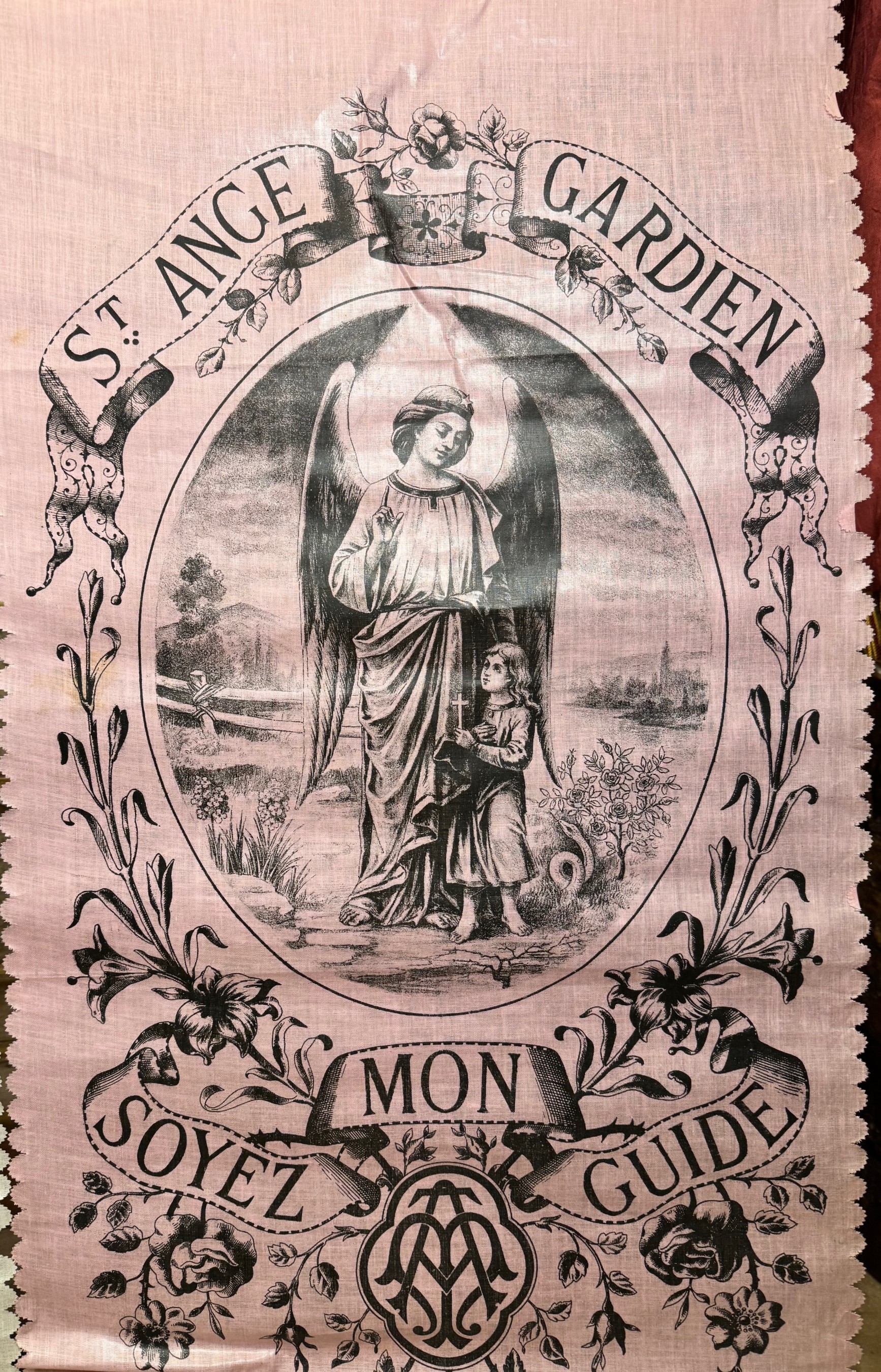 A touching collection of four banners dating from the early 20th century, depicting the Virgin and Child, Saint Joseph, Saint Bernadette Soubirous, and a guardian angel. Printed on a fine fabric in soft colors.