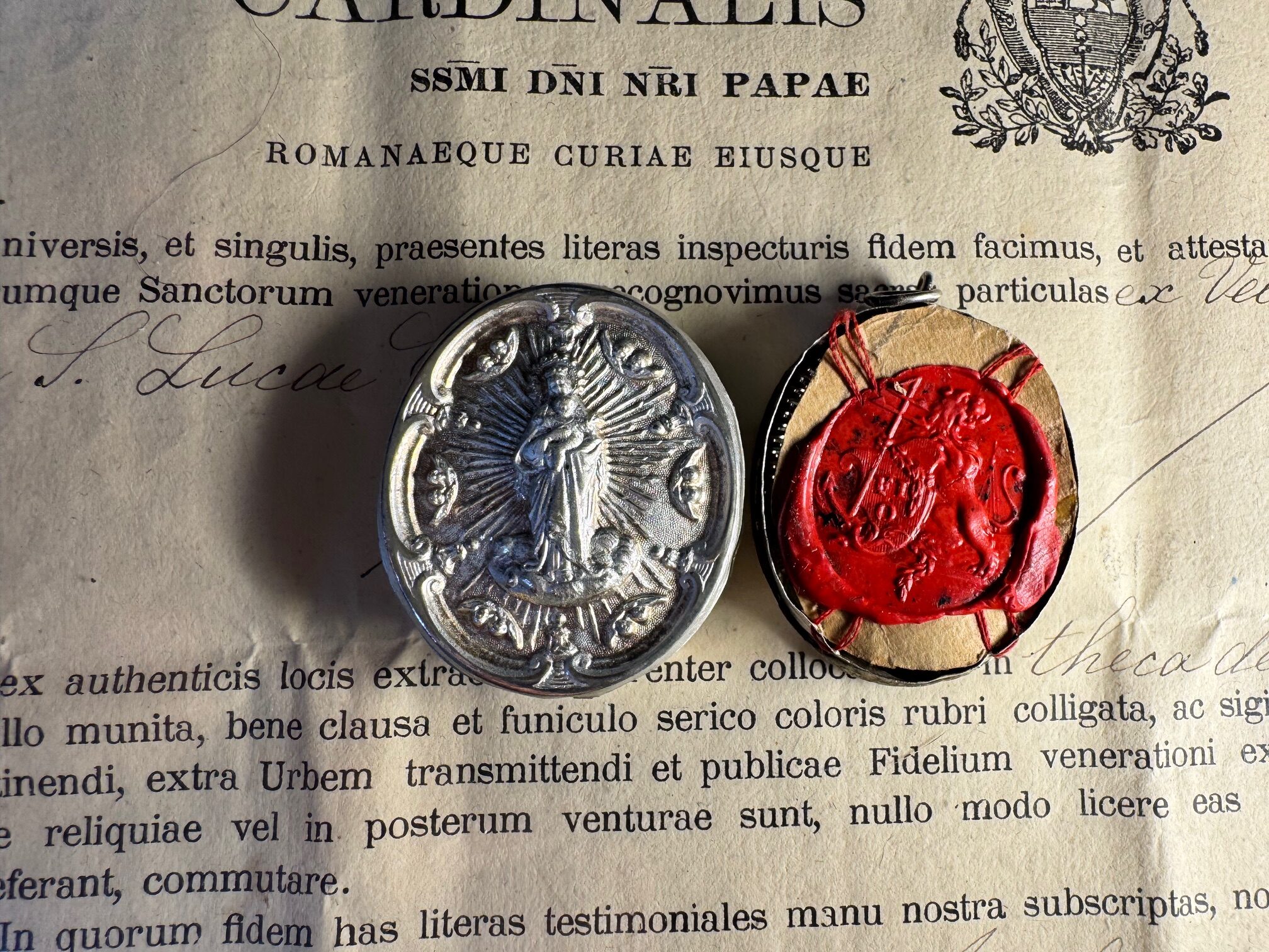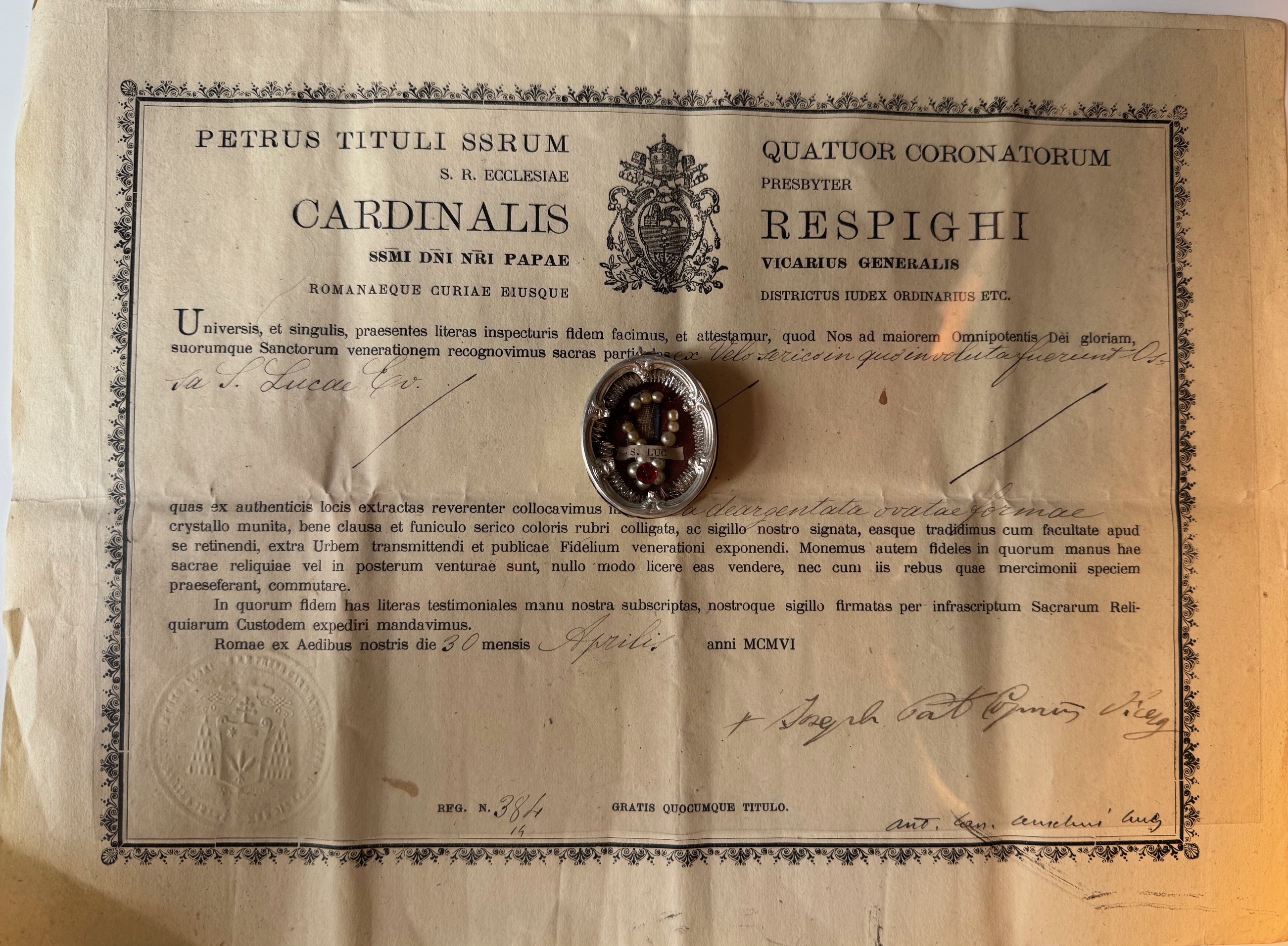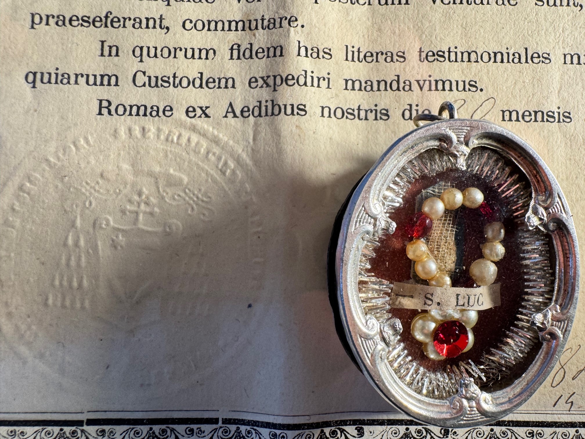 A second-class, contact relic, this "ex Velo serico in quo involuta fuerunt" for"from a silk veil in which the relics were wrapped". Honored here is a relic of Luke the Evangelist, in an oval thecawith an episcopal seal on the back, accompanied by its authentic dated April 301906. Dimensions 4 cm by 3 cm.