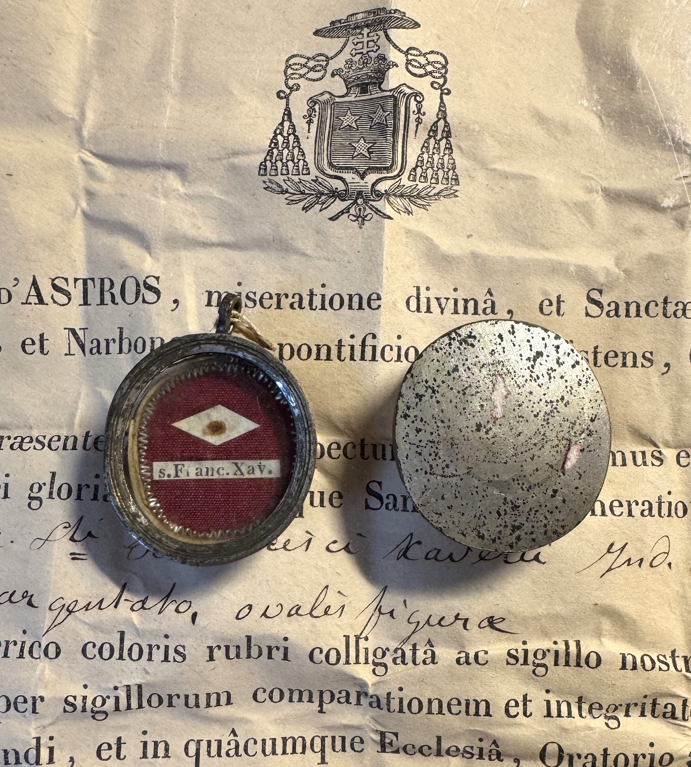 In a silver encolpion is a relic of Saint Francis Xavier, a 16th-century Jesuit missionary. The reliquary is sealed with an episcopal wax seal, as is fitting, identical to the attached certificate.