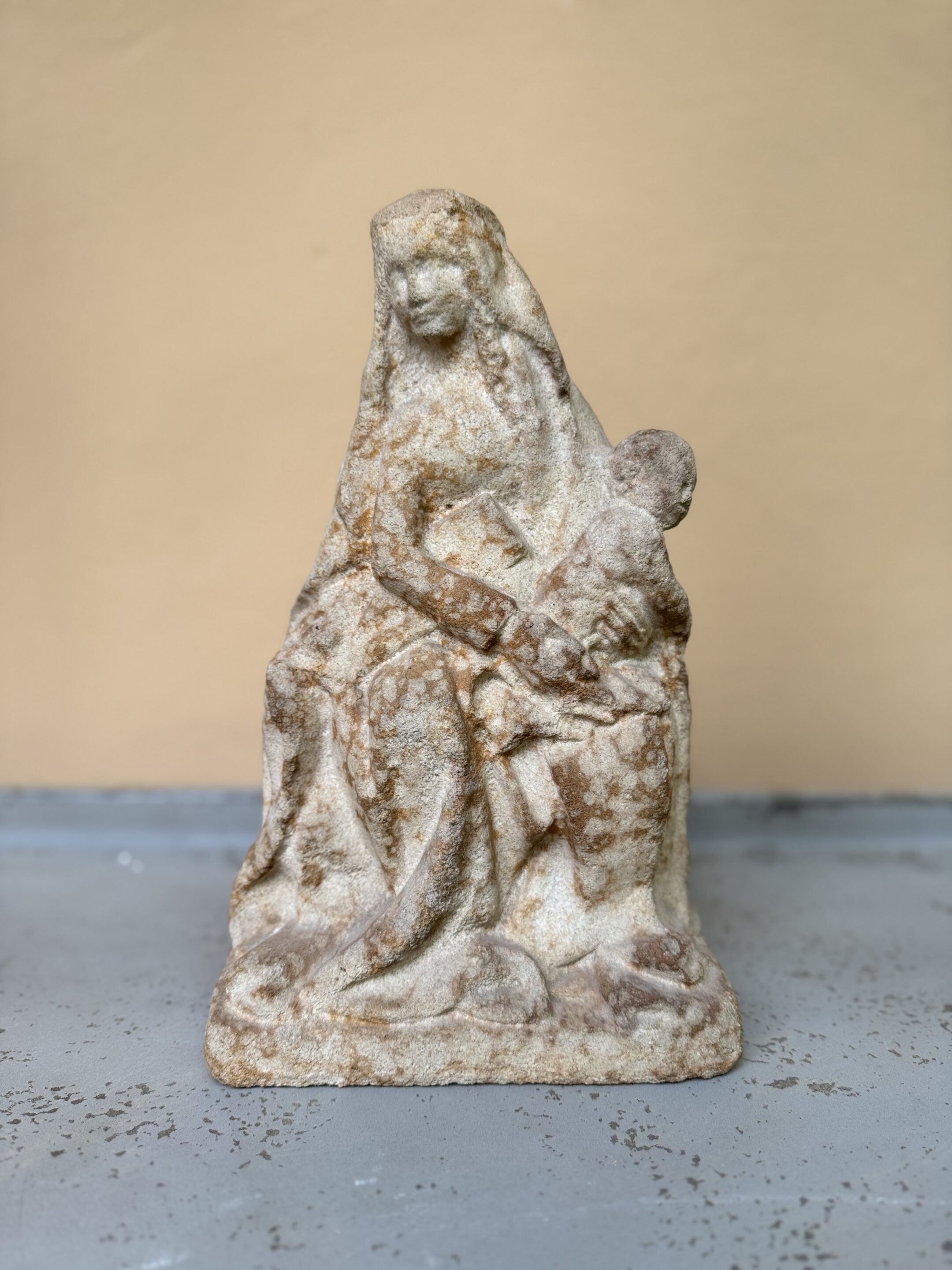 En pierre et à dos plat, la Vierge est coiffée d’un voile et tient l’Enfant sur son genou gauche.